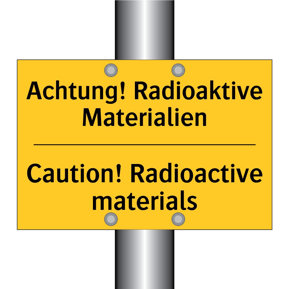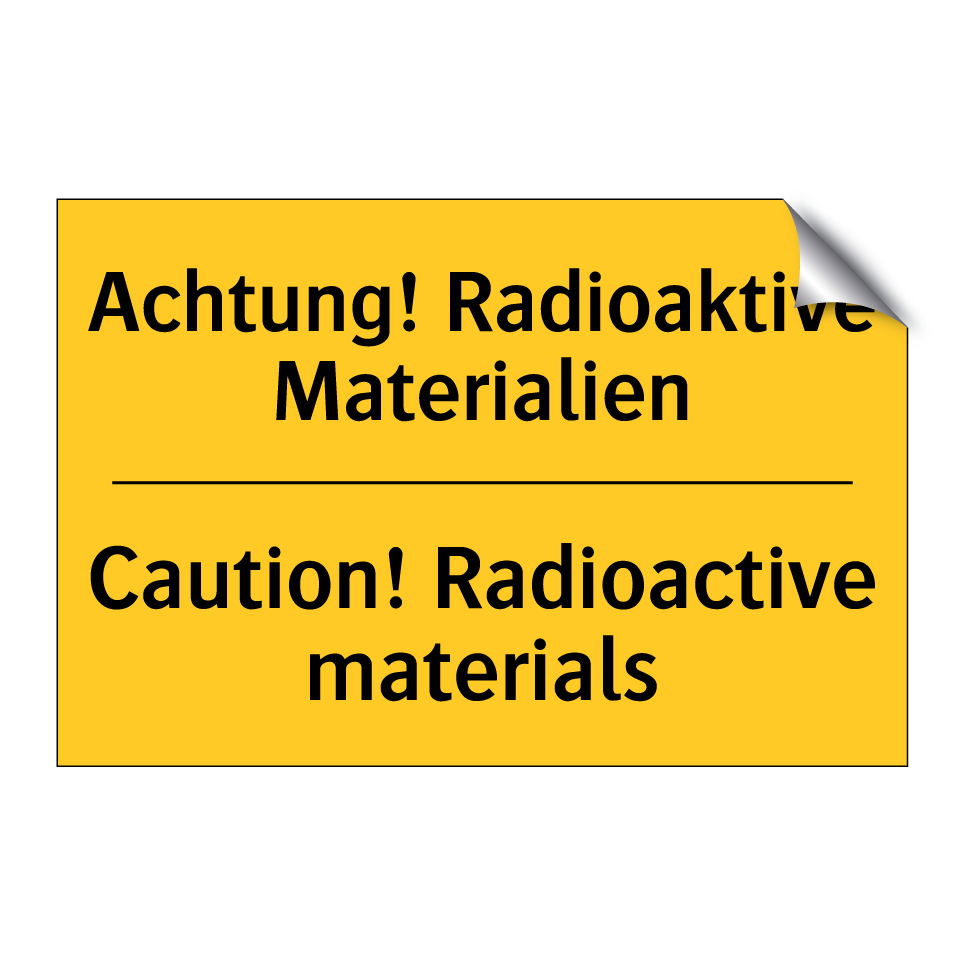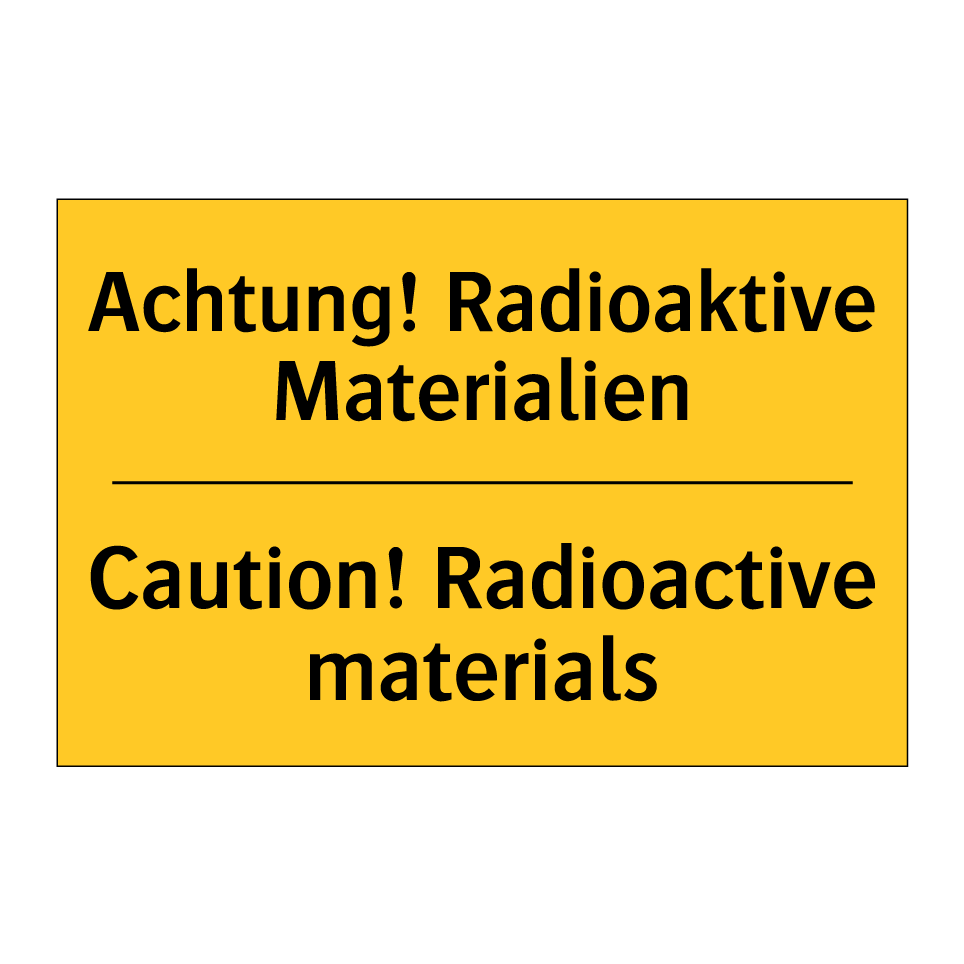 Zweisprachiges Warnschild mit deutschem Text Achtung! Radioaktive Materialien und englischem Text Caution! Radioactive materials