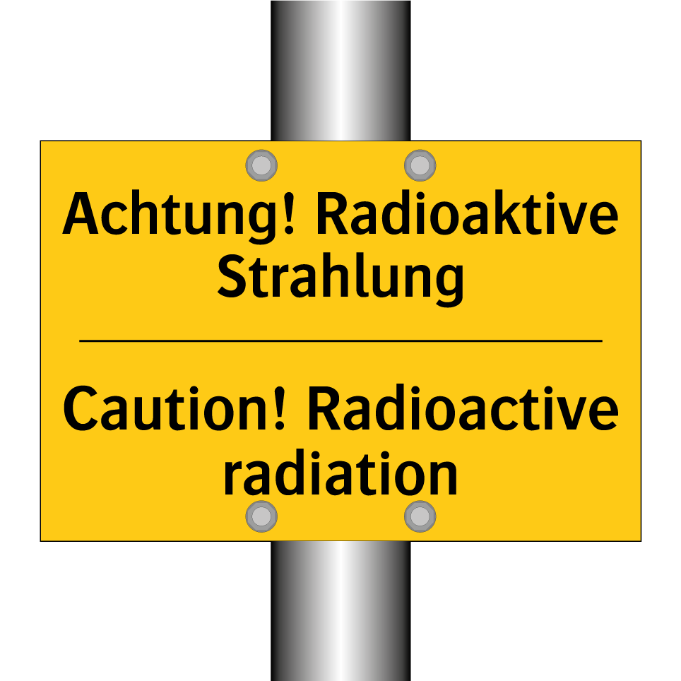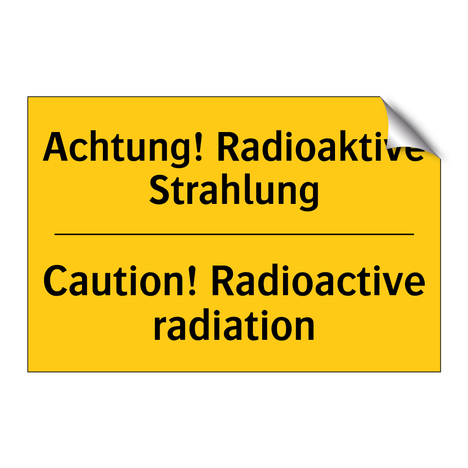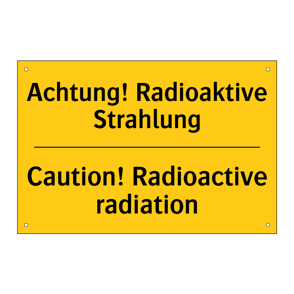Zweisprachiges Warnschild mit deutschem Text Achtung! Radioaktive Strahlung und englischem Text Caution! Radioactive radiation