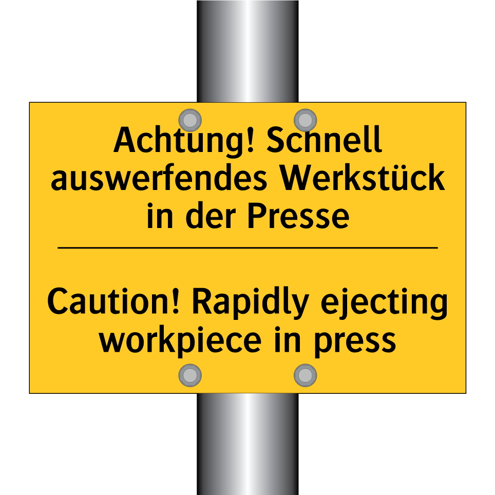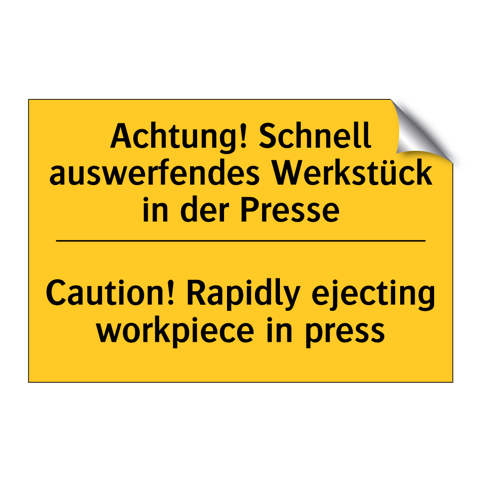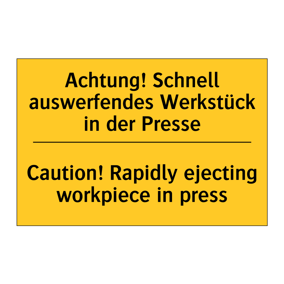 Zweisprachiges Warnschild mit deutschem Text Achtung! Schnell auswerfendes Werkstück in der Presse und englischem Text Caution! Rapidly ejecting workpiece in press