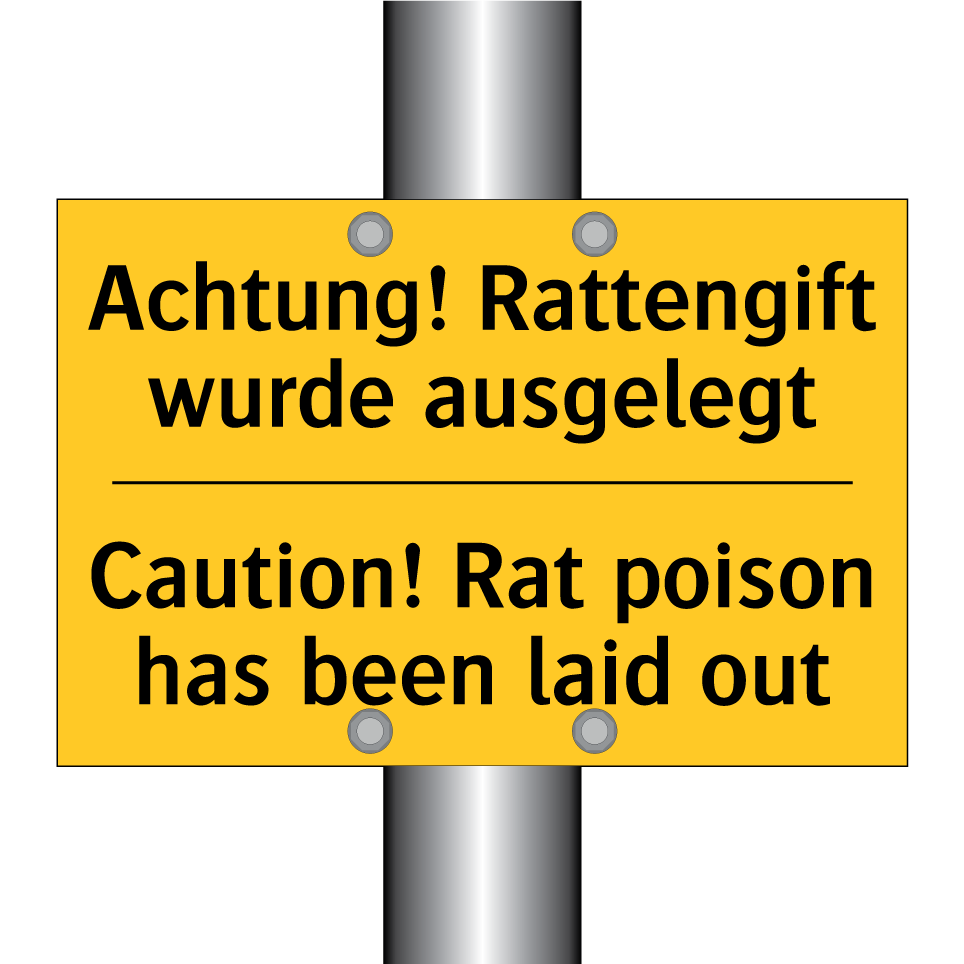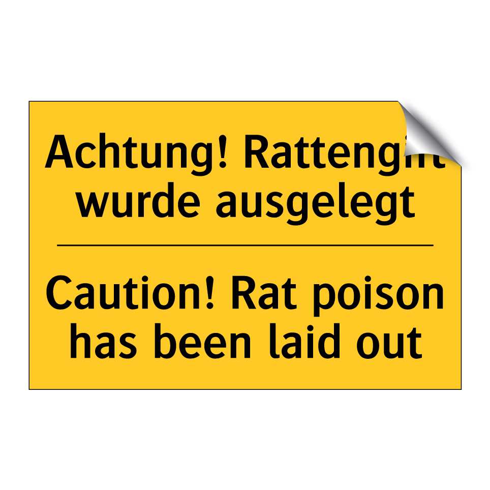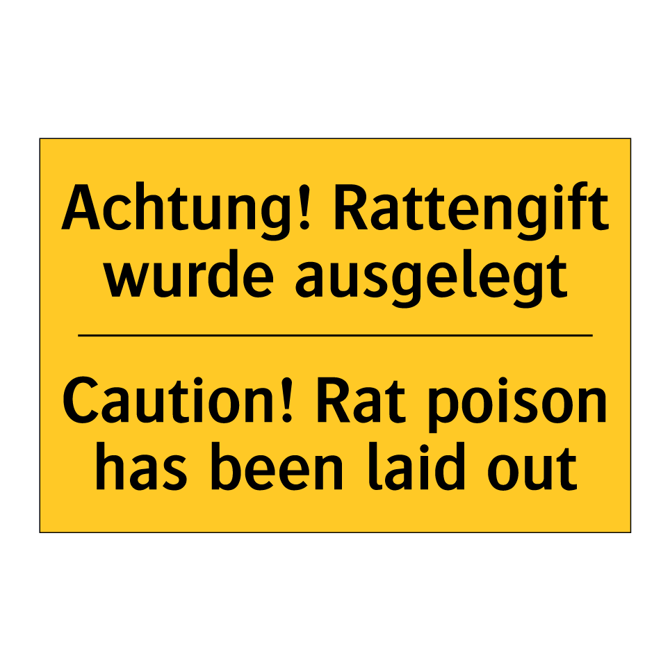 Zweisprachiges Warnschild mit deutschem Text Achtung! Rattengift wurde ausgelegt und englischem Text Caution! Rat poison has been laid out