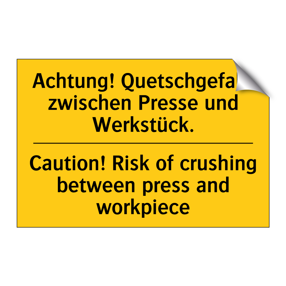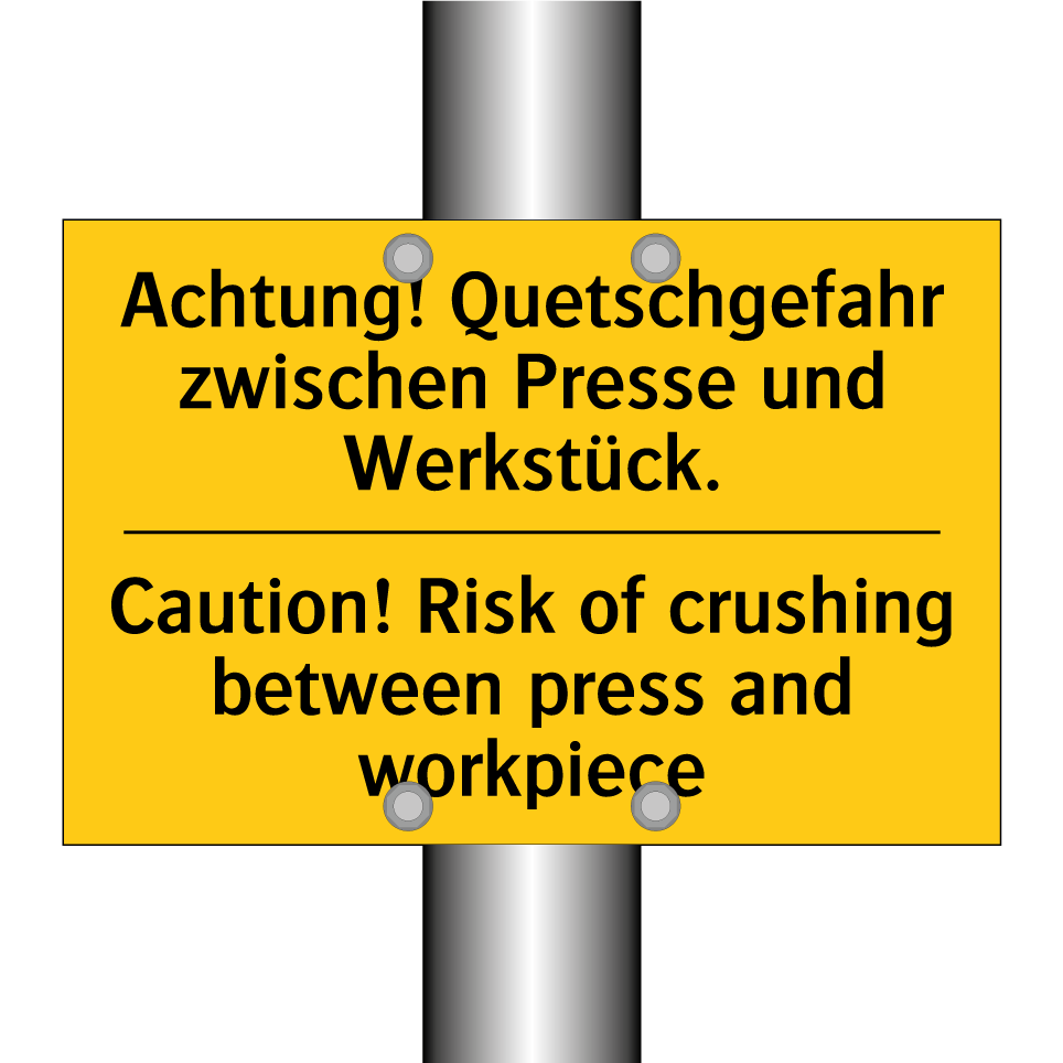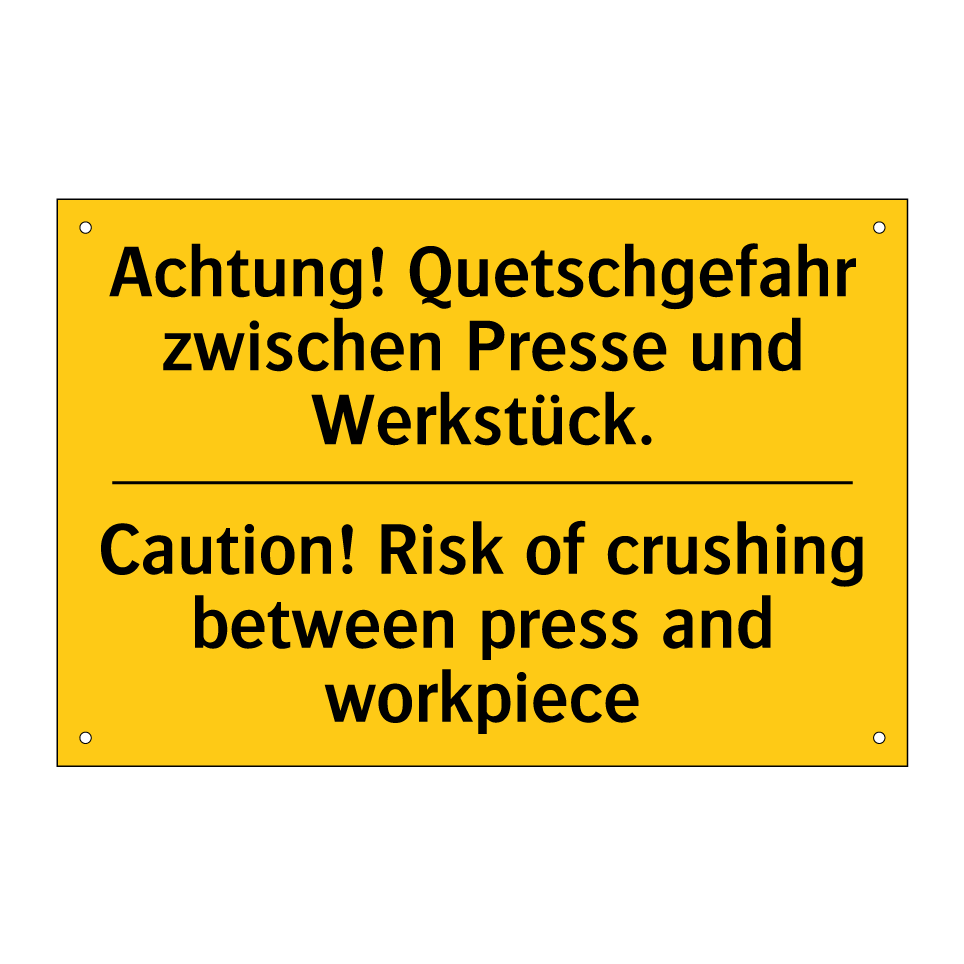 Zweisprachiges Warnschild mit deutschem Text Achtung! Quetschgefahr zwischen Presse und Werkstück. und englischem Text Caution! Risk of crushing between press and workpiece