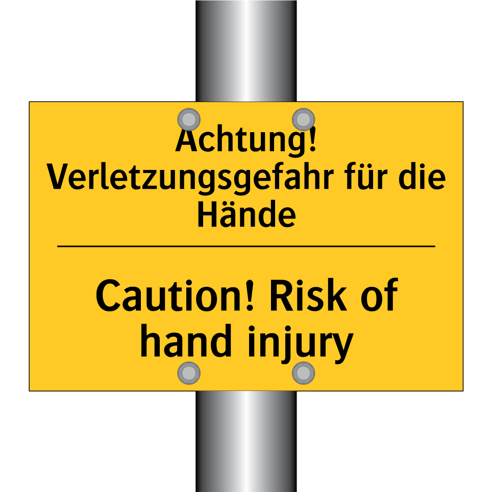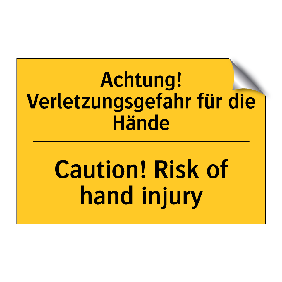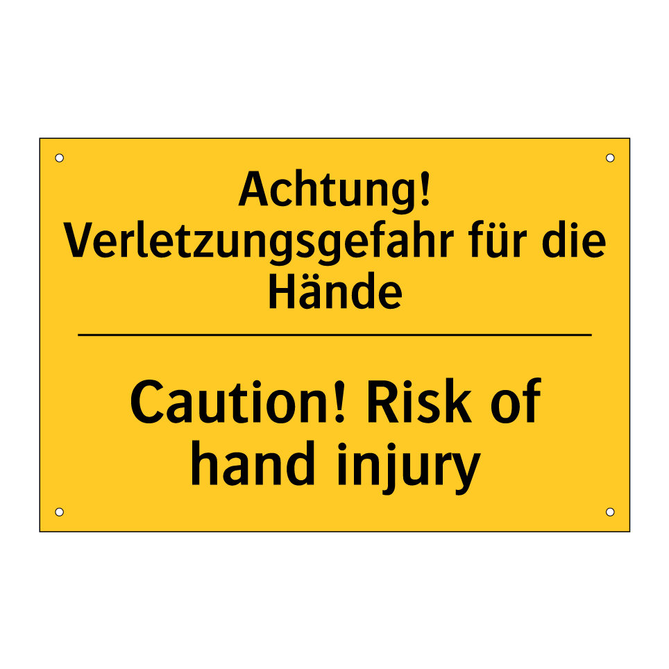 Zweisprachiges Warnschild mit deutschem Text Achtung! Verletzungsgefahr für die Hände und englischem Text Caution! Risk of hand injury