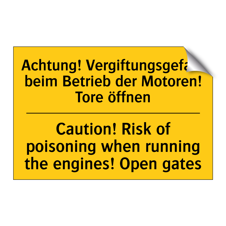 Zweisprachiges Warnschild mit deutschem Text Achtung! Vergiftungsgefahr beim Betrieb der Motoren! Tore öffnen und englischem Text Caution! Risk of poisoning when running the engines! Open gates