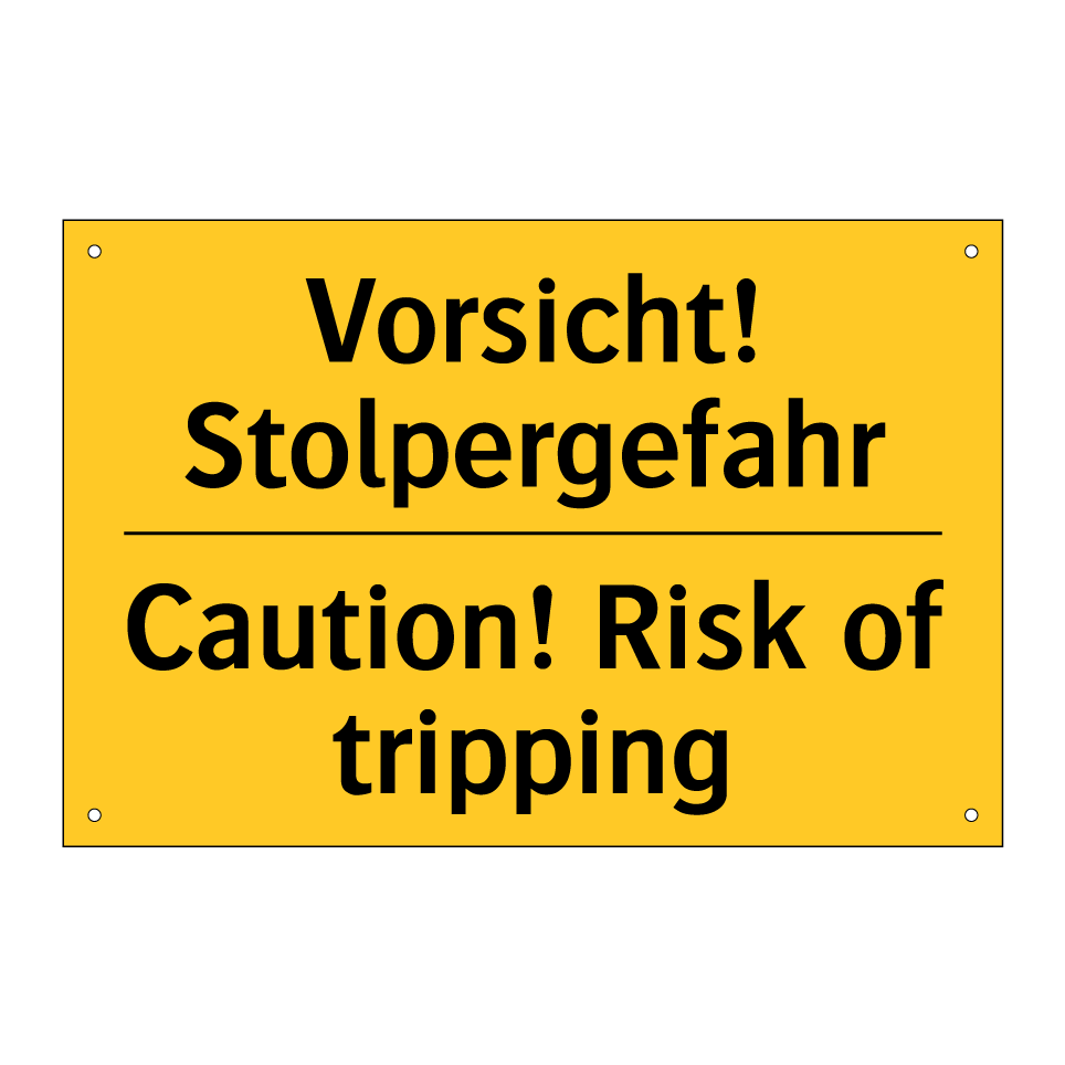 Zweisprachiges Warnschild mit deutschem Text Vorsicht! Stolpergefahr und englischem Text Caution! Risk of tripping