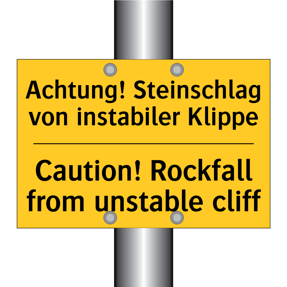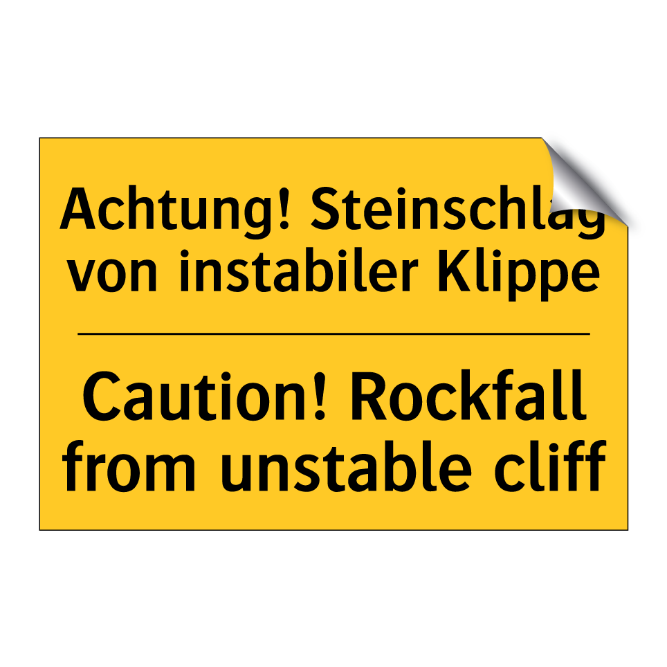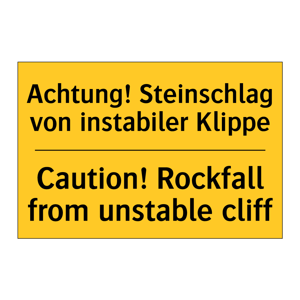 Zweisprachiges Warnschild mit deutschem Text Achtung! Steinschlag von instabiler Klippe und englischem Text Caution! Rockfall from unstable cliff