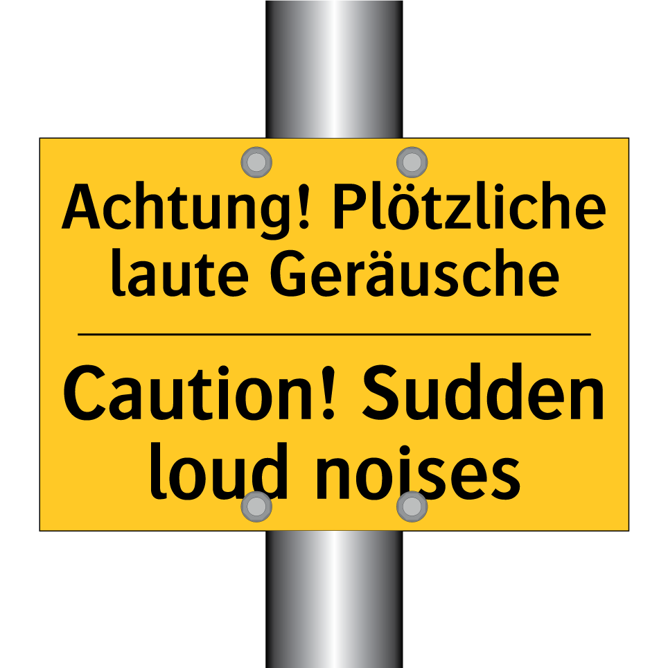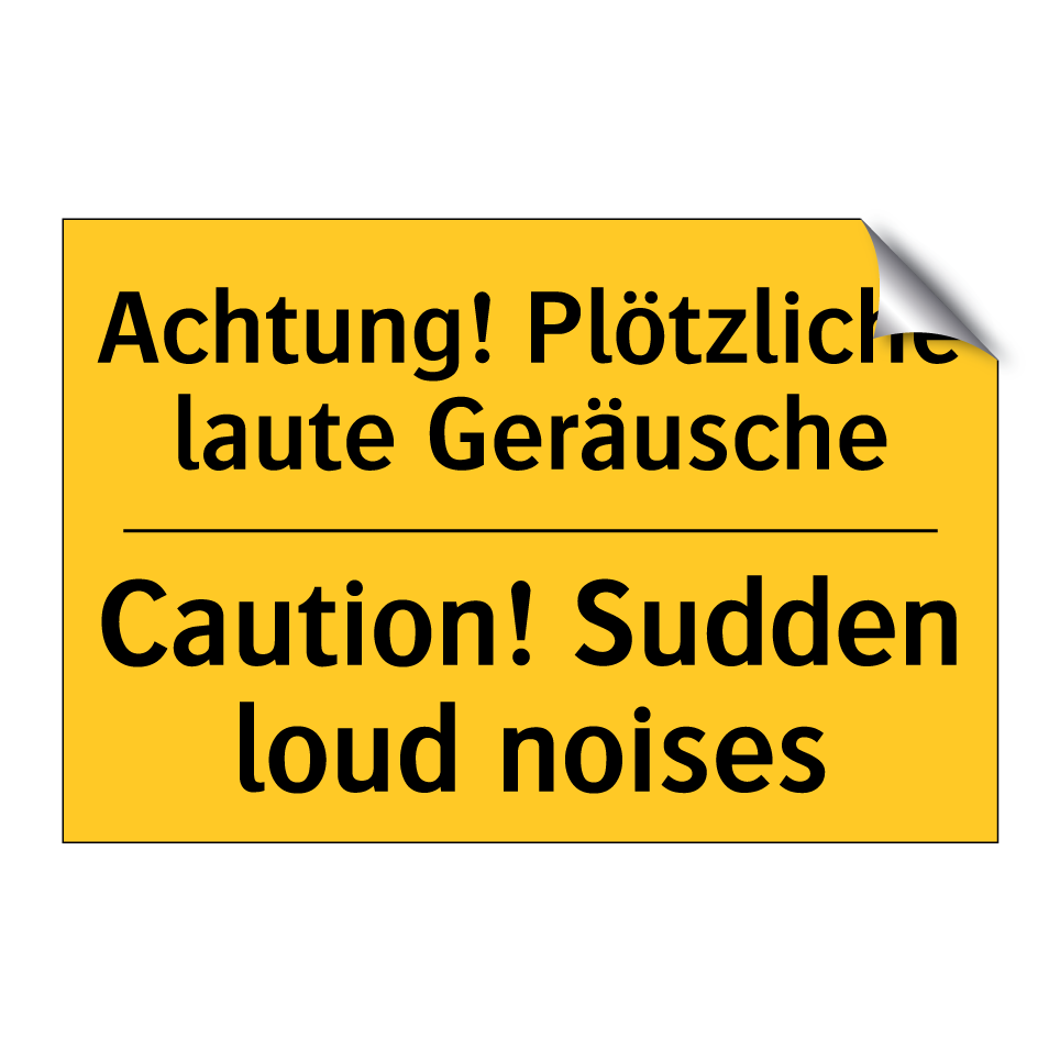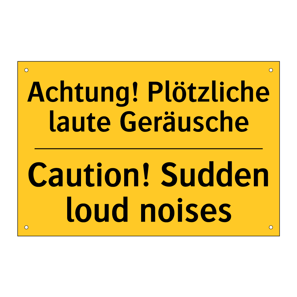Zweisprachiges Warnschild mit deutschem Text Achtung! Plötzliche laute Geräusche und englischem Text Caution! Sudden loud noises