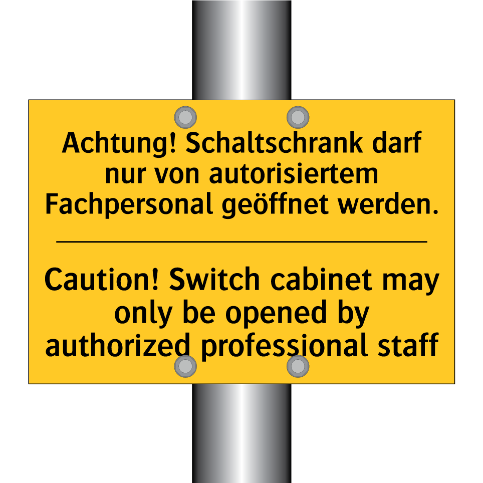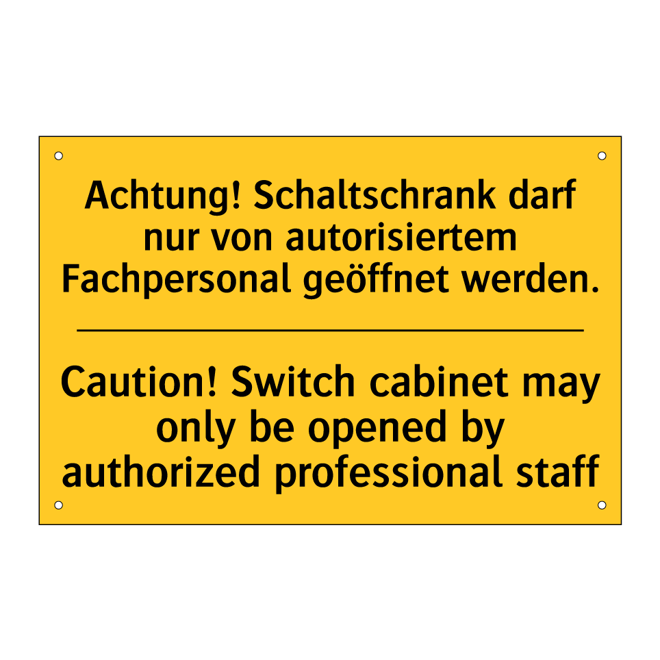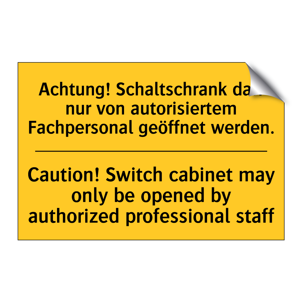 Zweisprachiges Warnschild mit deutschem Text Achtung! Schaltschrank darf nur von autorisiertem Fachpersonal geöffnet werden. und englischem Text Caution! Switch cabinet may only be opened by authorized professional staff