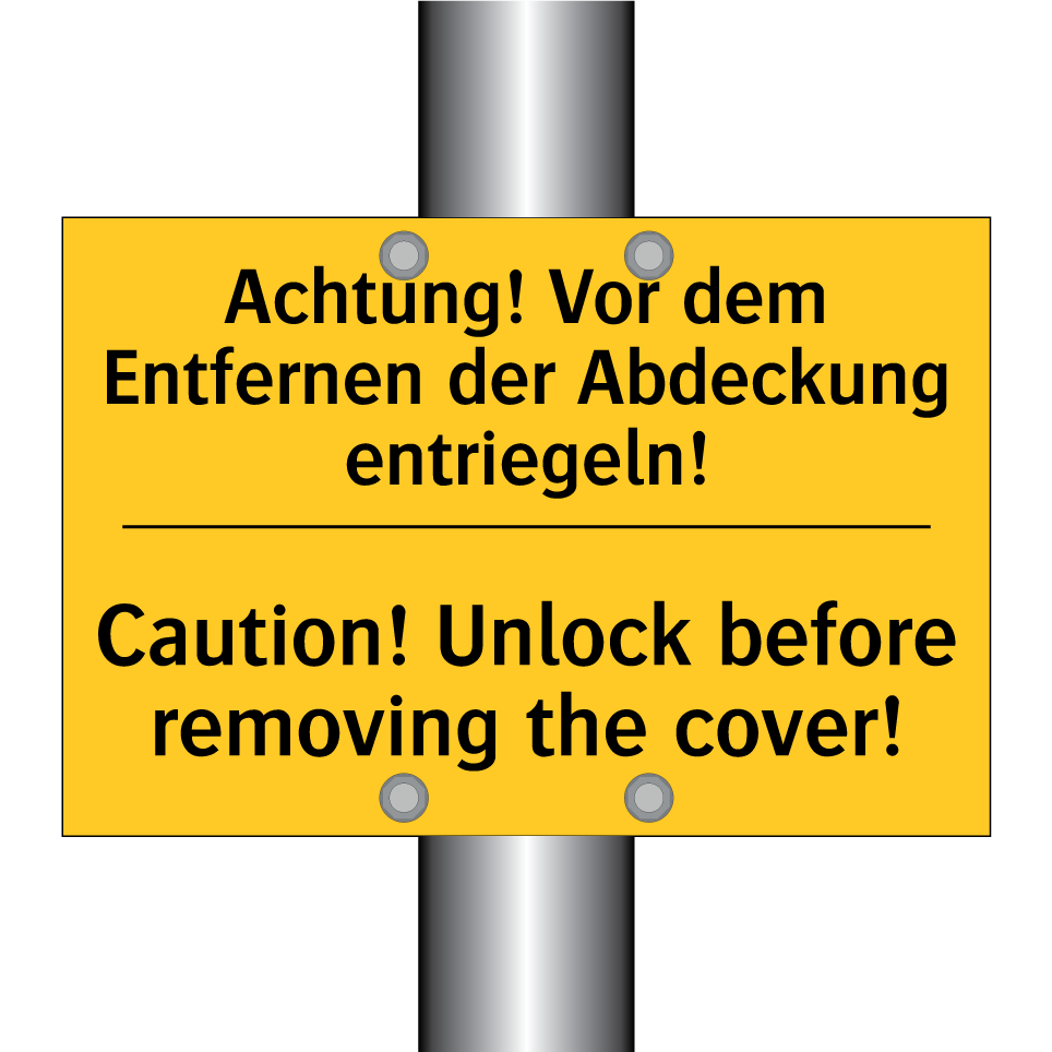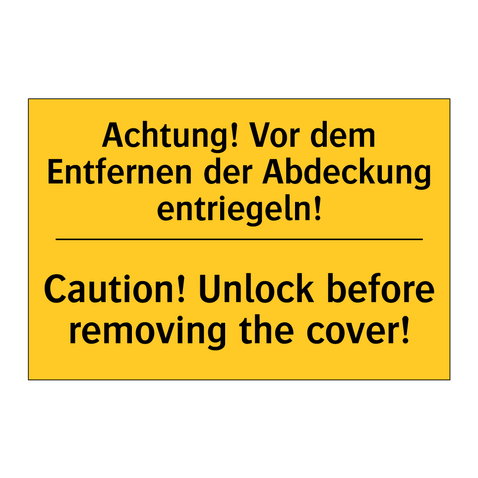 Zweisprachiges Warnschild mit deutschem Text Achtung! Vor dem Entfernen der Abdeckung entriegeln! und englischem Text Caution! Unlock before removing the cover!