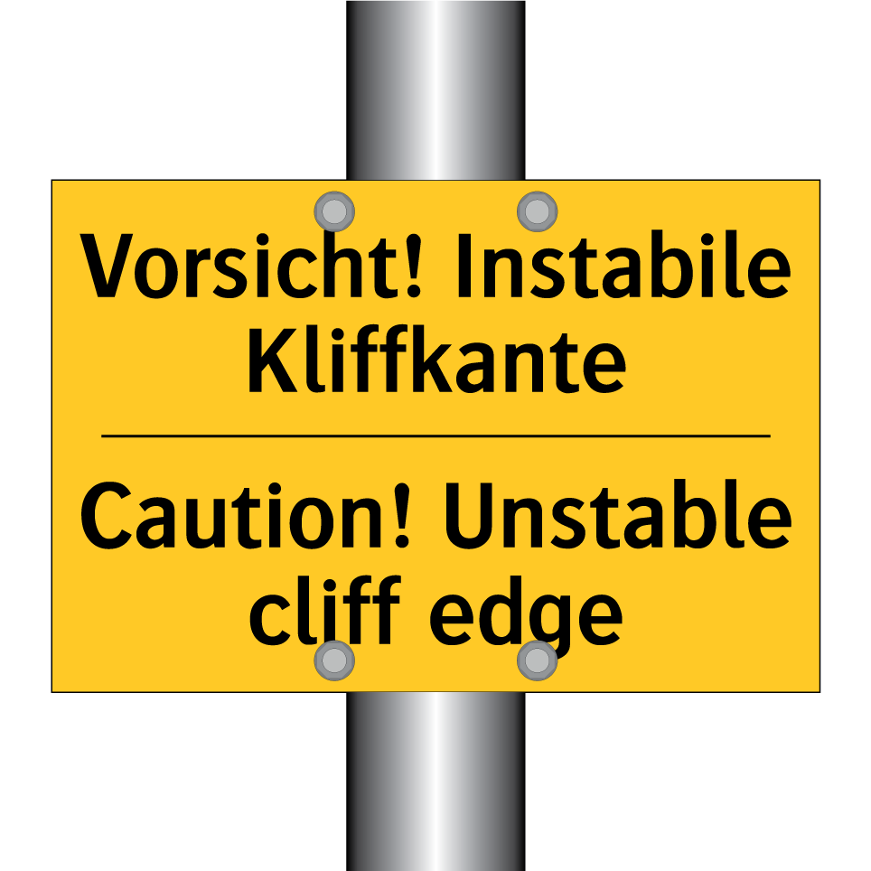 Zweisprachiges Warnschild mit deutschem Text Vorsicht! Instabile Kliffkante und englischem Text Caution! Unstable cliff edge