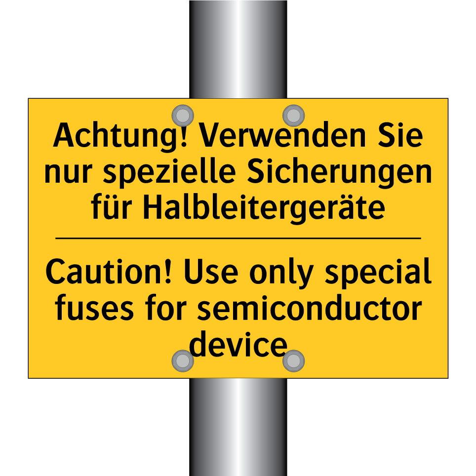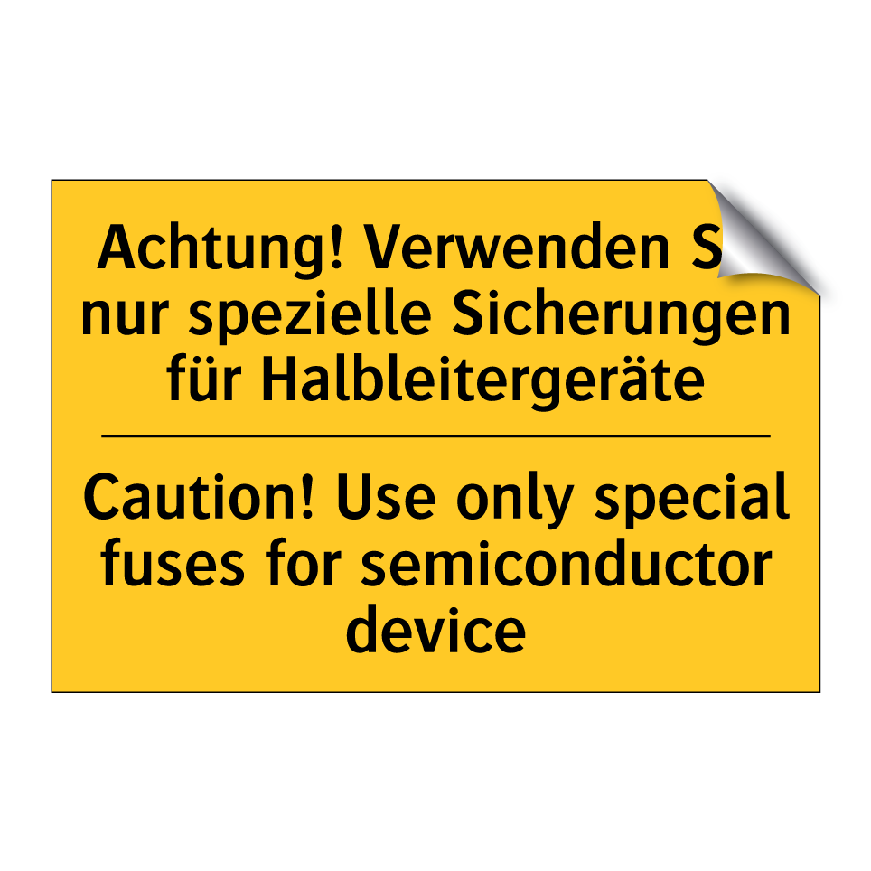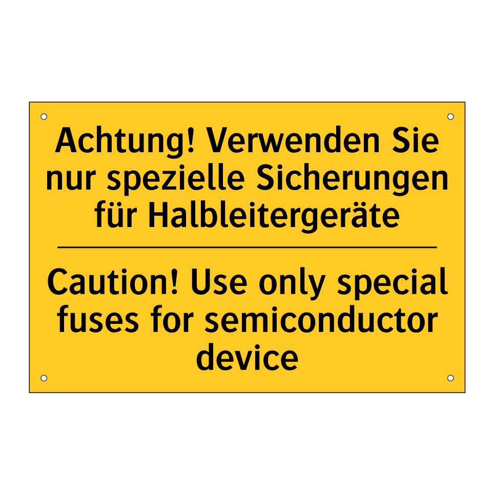 Zweisprachiges Warnschild mit deutschem Text Achtung! Verwenden Sie nur spezielle Sicherungen für Halbleitergeräte und englischem Text Caution! Use only special fuses for semiconductor device