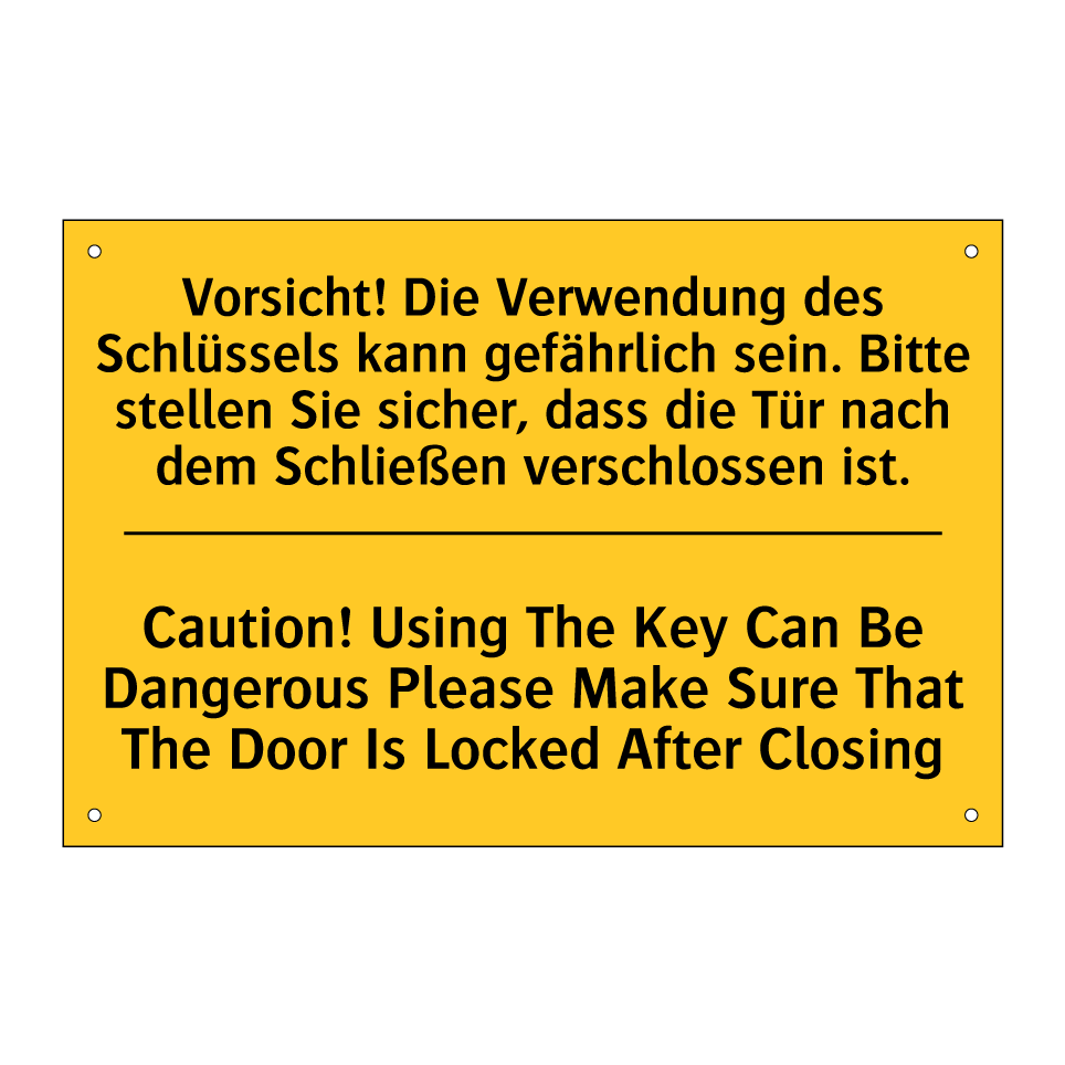 Zweisprachiges Warnschild mit deutschem Text Vorsicht! Die Verwendung des Schlüssels kann gefährlich sein. Bitte stellen Sie sicher, dass die Tür nach dem Schließen verschlossen ist. und englischem Text Caution! Using The Key Can Be Dangerous Please Make Sure That The Door Is Locked After Closing