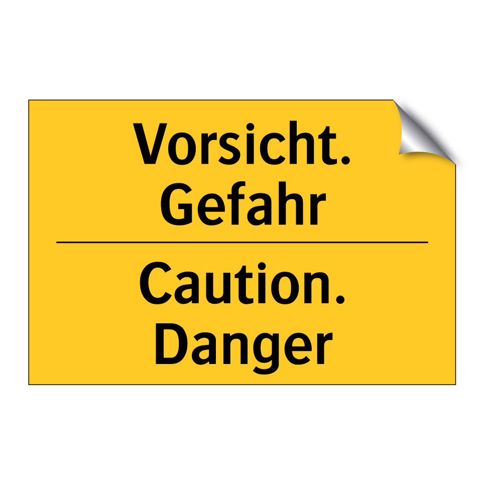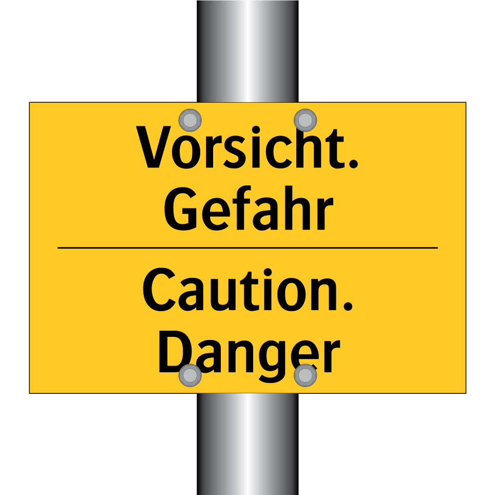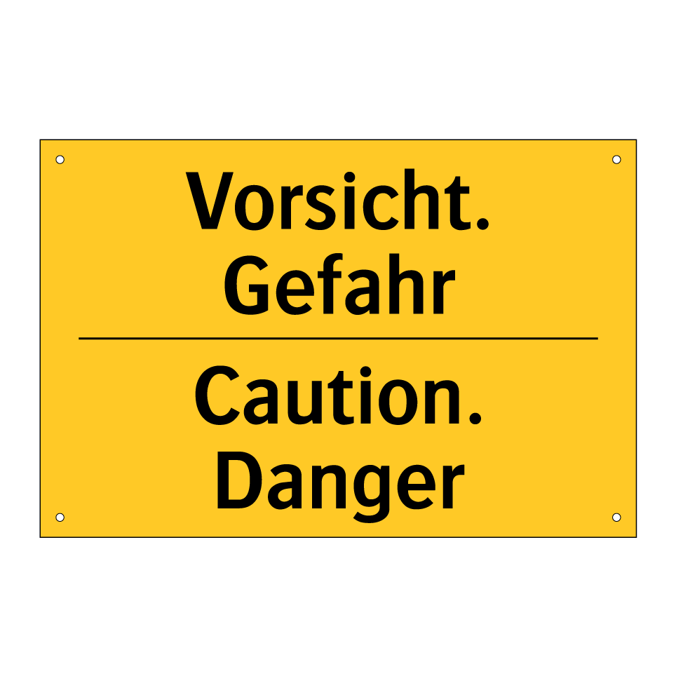 Zweisprachiges Warnschild mit deutschem Text Vorsicht. Gefahr und englischem Text Caution. Danger