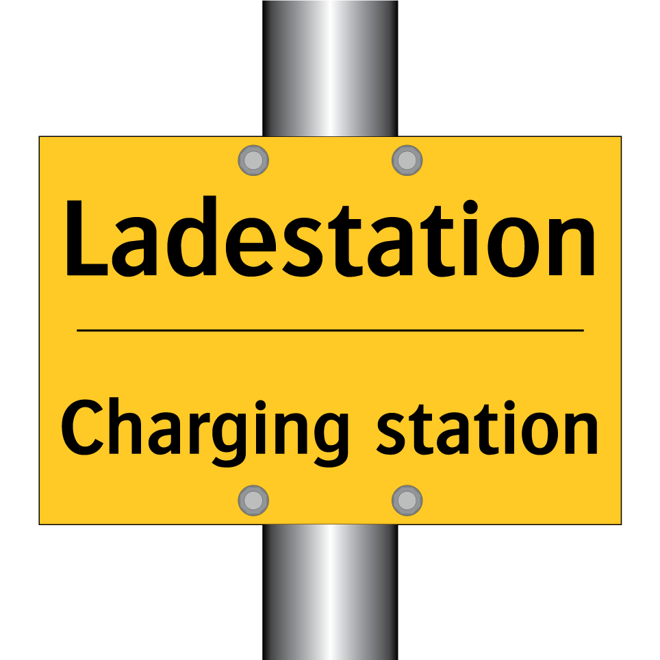 Zweisprachiges Warnschild mit deutschem Text Ladestation und englischem Text Charging station