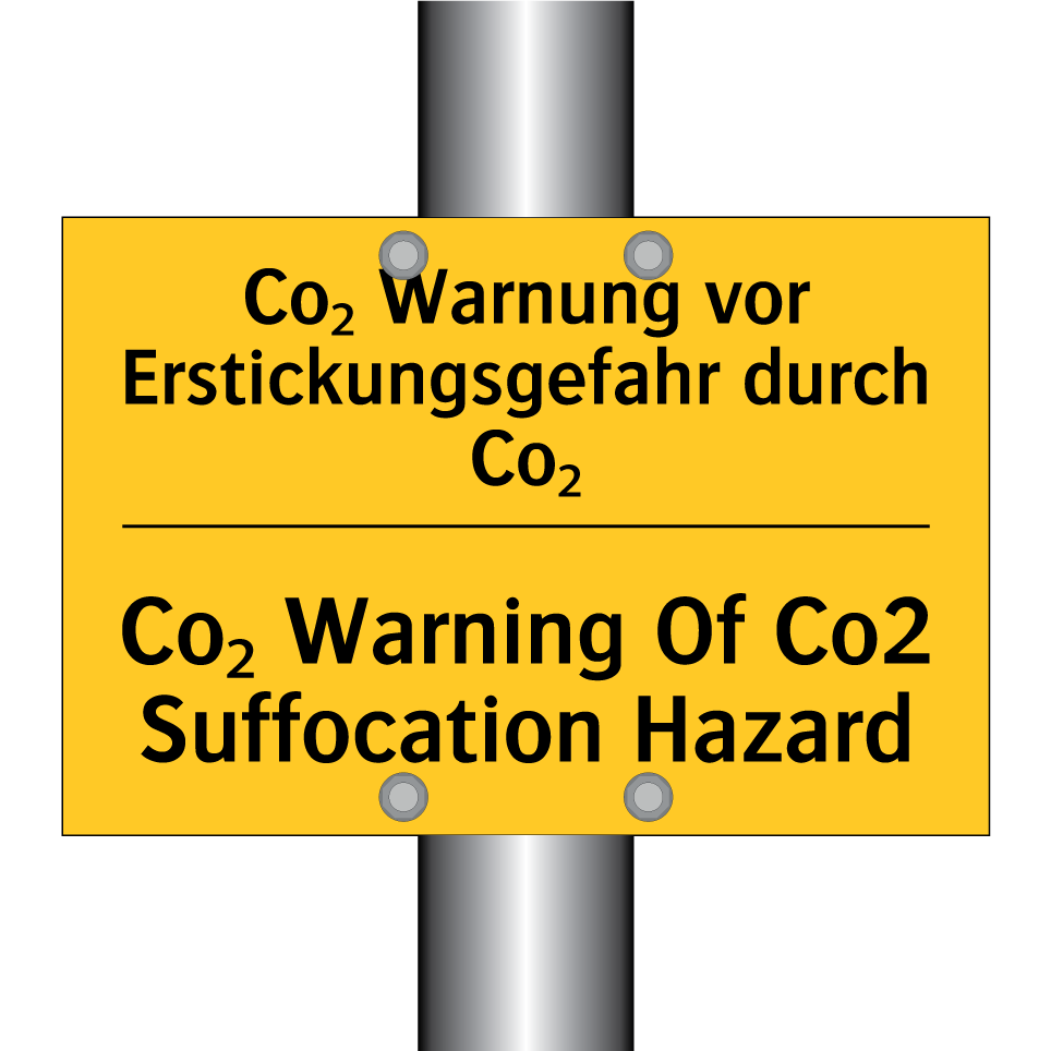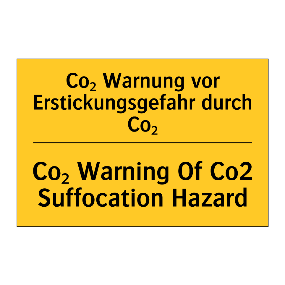 Zweisprachiges Warnschild mit deutschem Text Co₂ Warnung vor Erstickungsgefahr durch Co₂ und englischem Text Co₂ Warning Of Co2 Suffocation Hazard