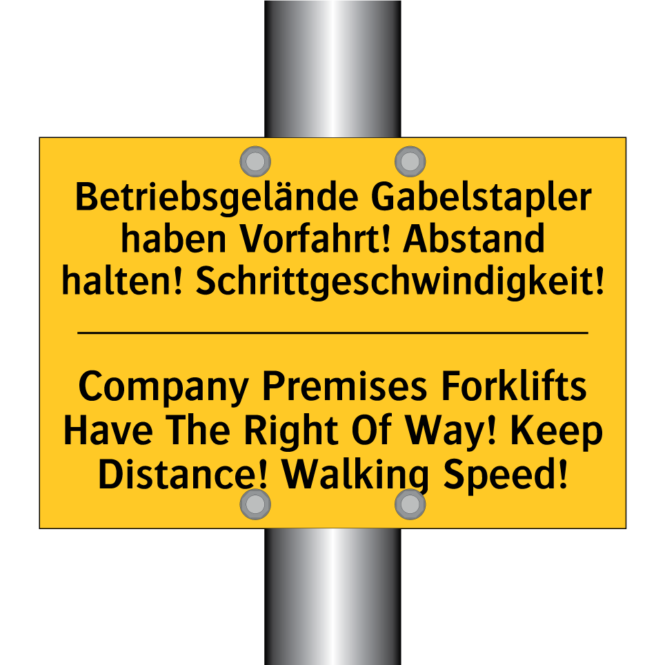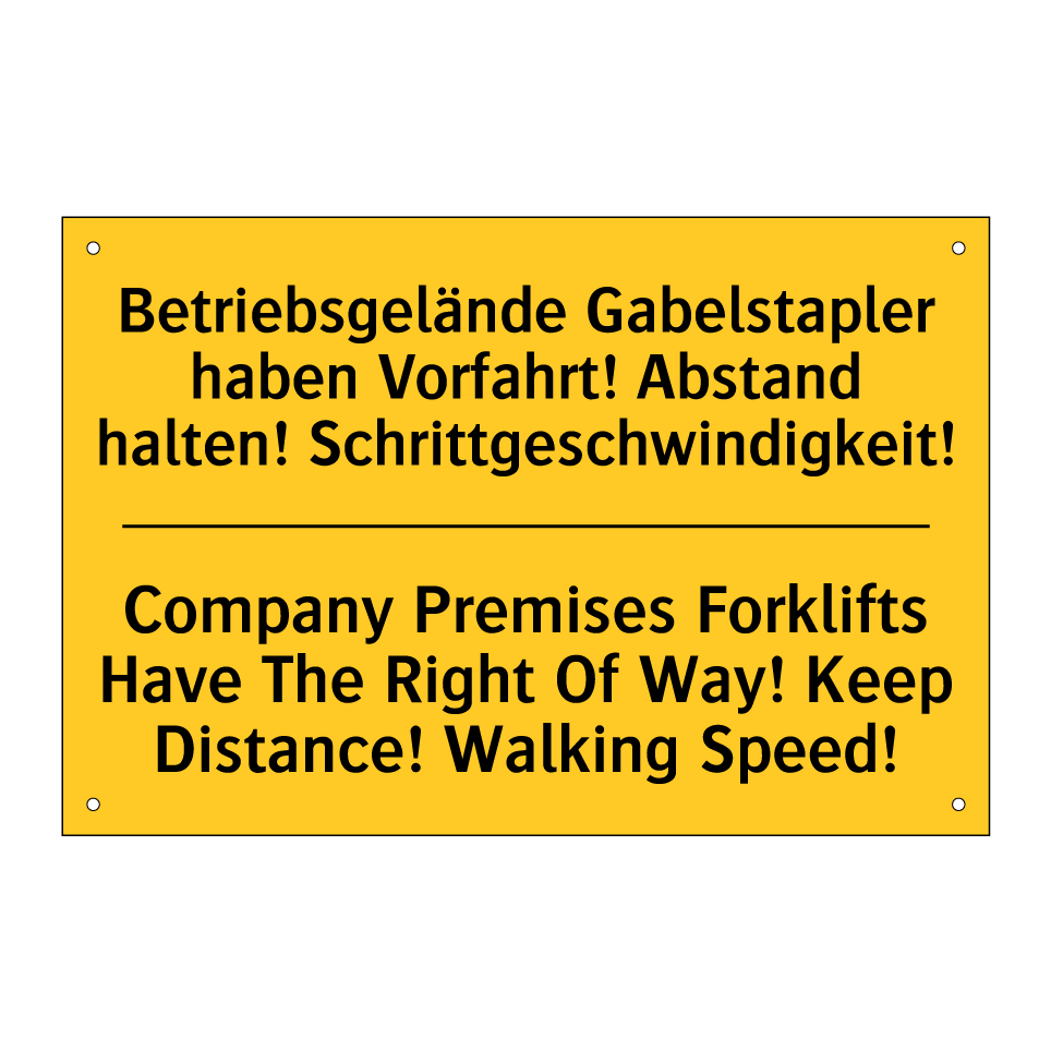 Zweisprachiges Warnschild mit deutschem Text Betriebsgelände Gabelstapler haben Vorfahrt! Abstand halten! Schrittgeschwindigkeit! und englischem Text Company Premises Forklifts Have The Right Of Way! Keep Distance! Walking Speed!
