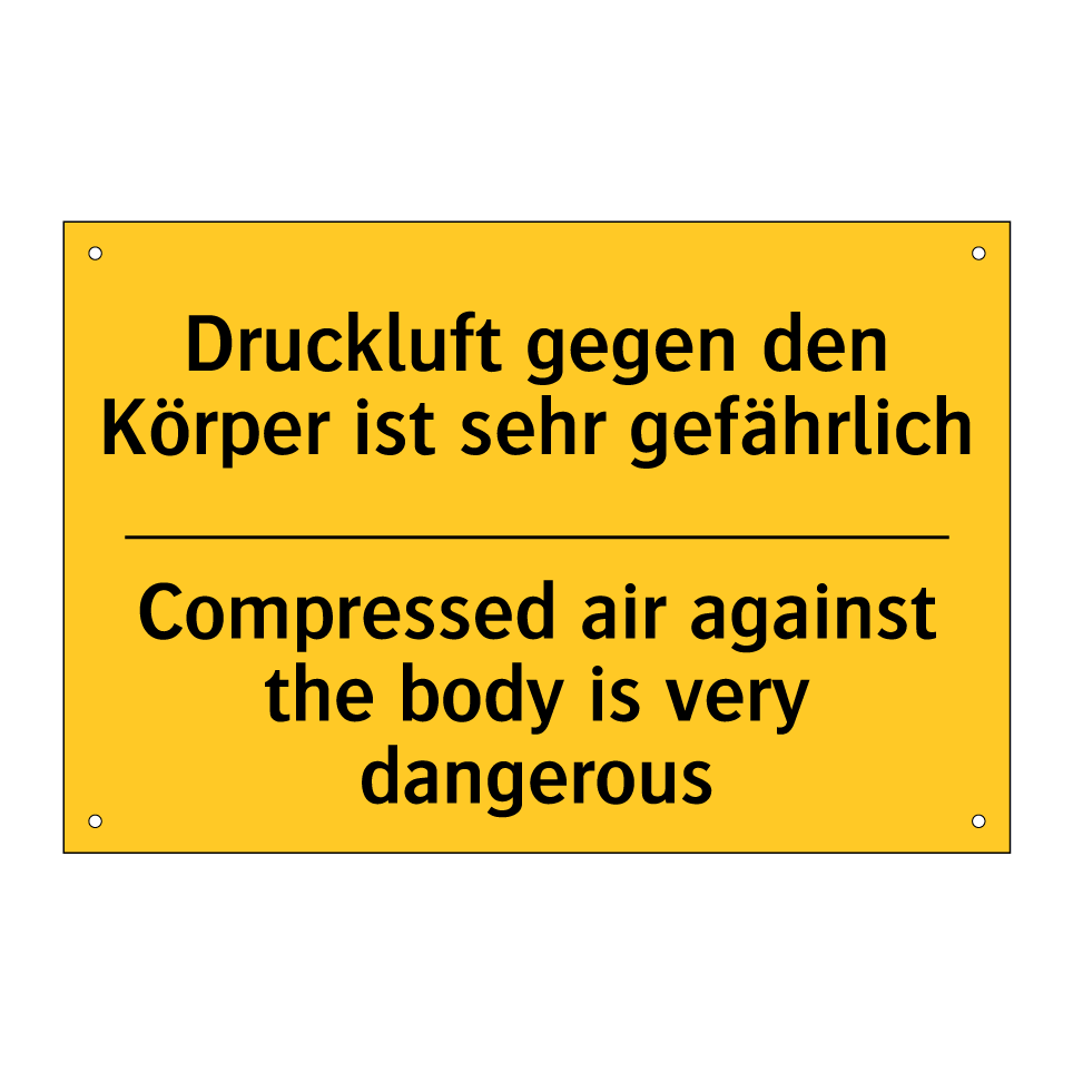 Zweisprachiges Warnschild mit deutschem Text Druckluft gegen den Körper ist sehr gefährlich und englischem Text Compressed air against the body is very dangerous