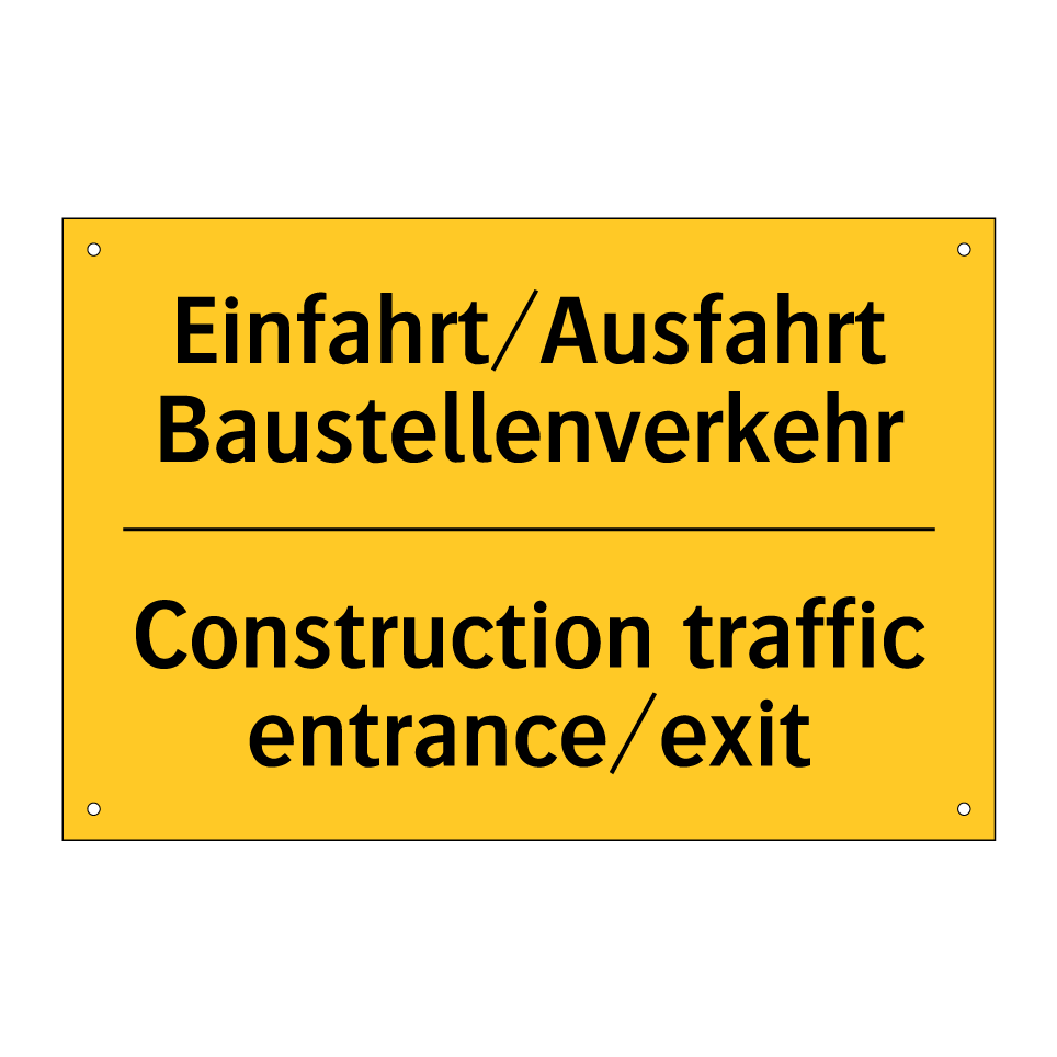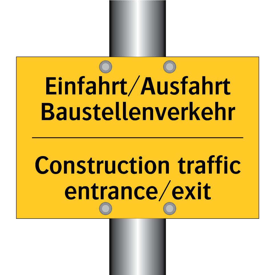 Zweisprachiges Warnschild mit deutschem Text Einfahrt/Ausfahrt Baustellenverkehr und englischem Text Construction traffic entrance/exit