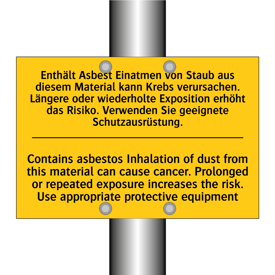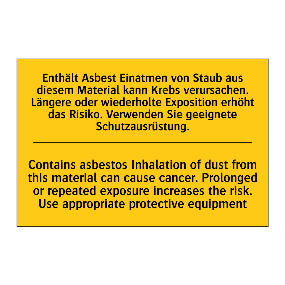 Zweisprachiges Warnschild mit deutschem Text Enthält Asbest Einatmen von Staub aus diesem Material kann Krebs verursachen. Längere oder wiederholte Exposition erhöht das Risiko. Verwenden Sie geeignete Schutzausrüstung. und englischem Text Contains asbestos Inhalation of dust from this material can cause cancer. Prolonged or repeated exposure increases the risk. Use appropriate protective equipment