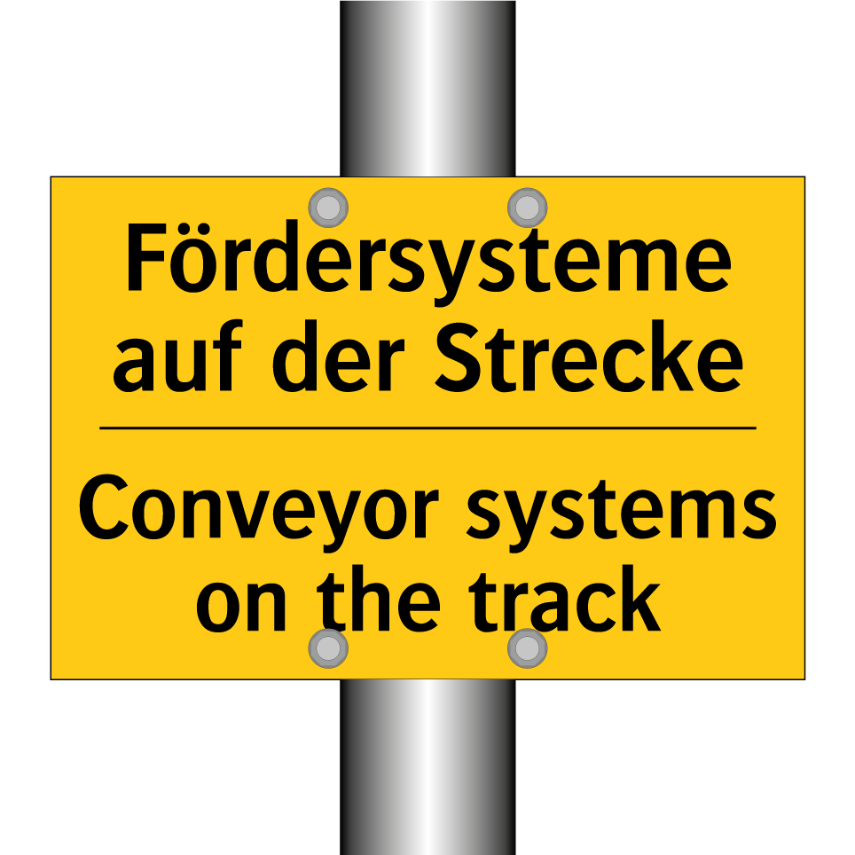 Zweisprachiges Warnschild mit deutschem Text Fördersysteme auf der Strecke und englischem Text Conveyor systems on the track