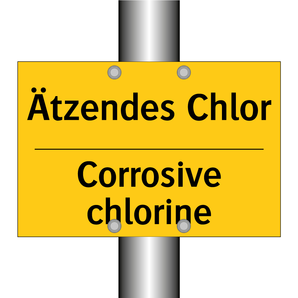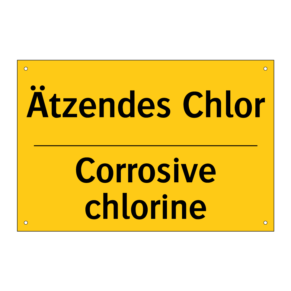 Zweisprachiges Warnschild mit deutschem Text Ätzendes Chlor und englischem Text Corrosive chlorine
