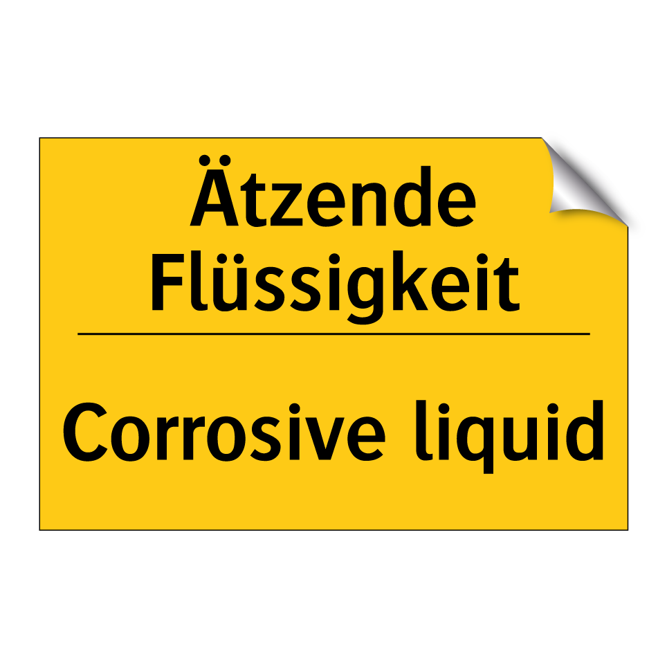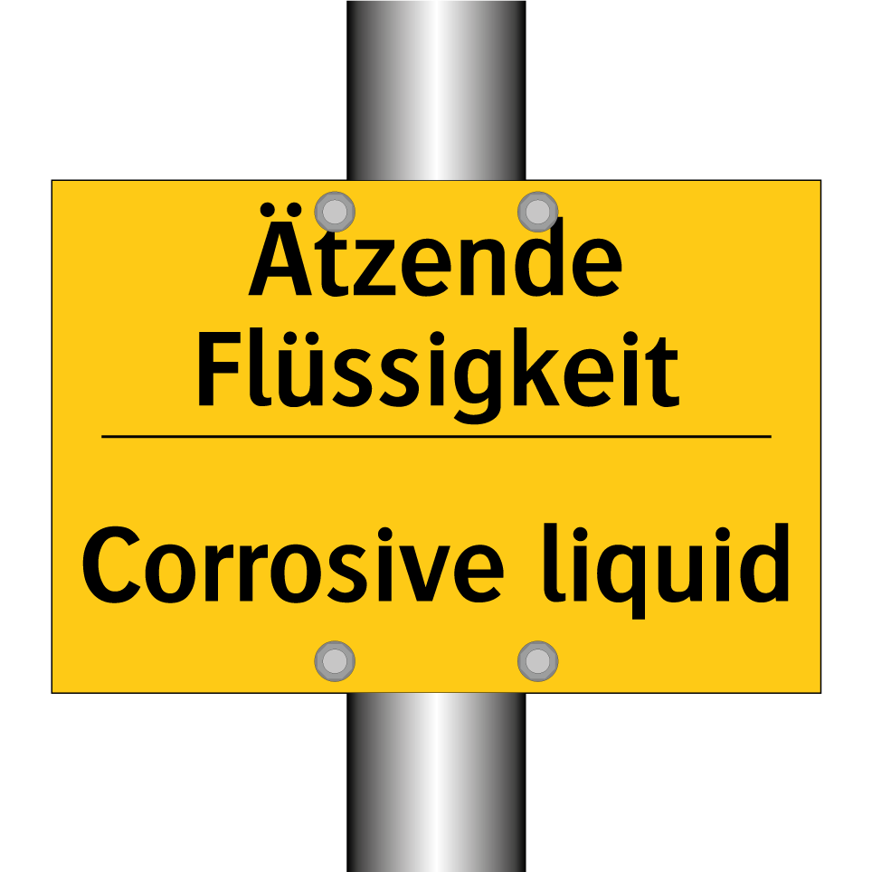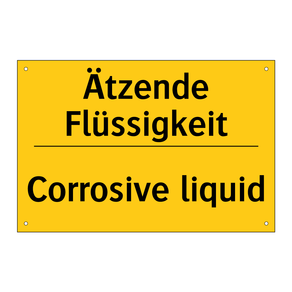 Zweisprachiges Warnschild mit deutschem Text Ätzende Flüssigkeit und englischem Text Corrosive liquid