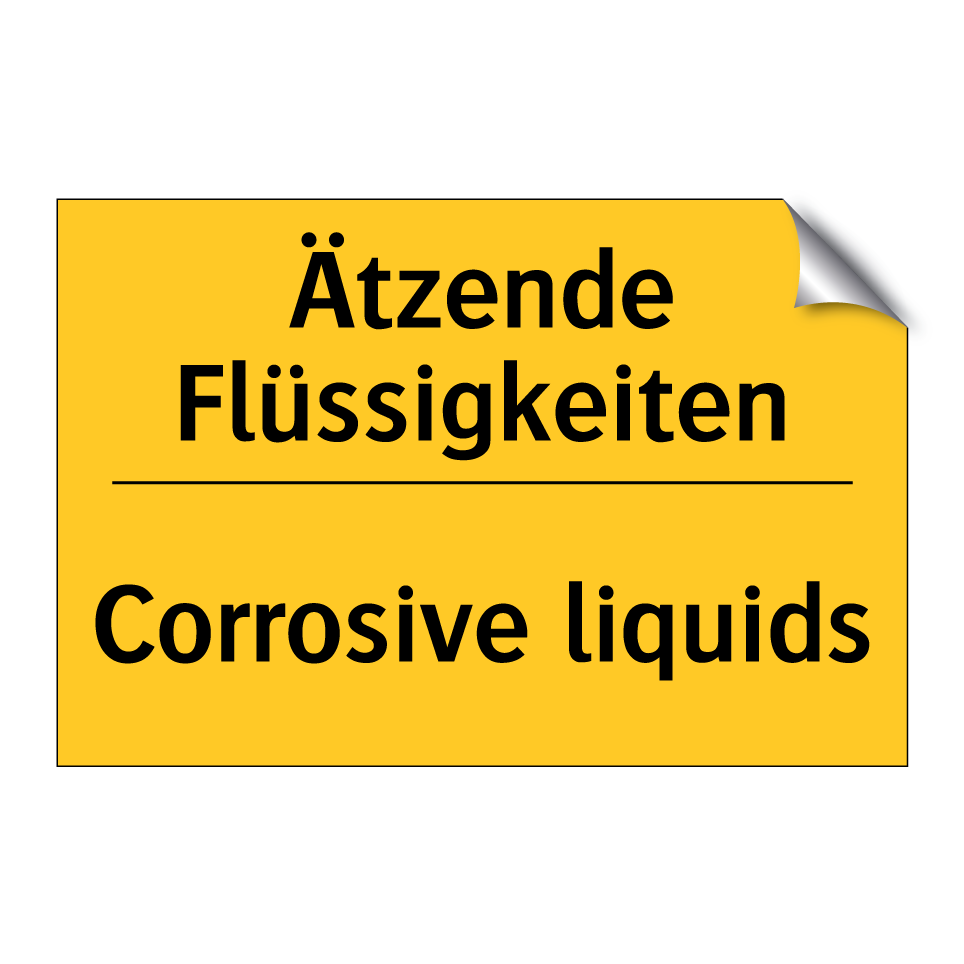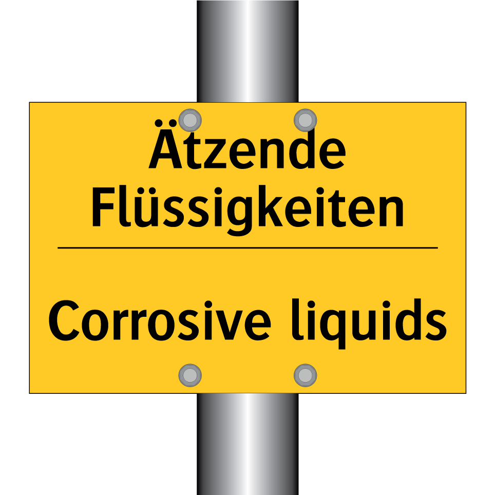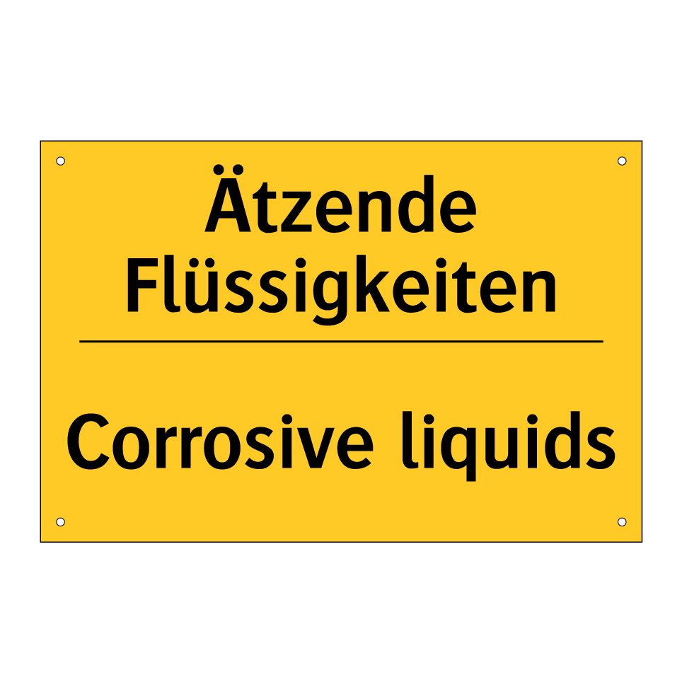 Zweisprachiges Warnschild mit deutschem Text Ätzende Flüssigkeiten und englischem Text Corrosive liquids