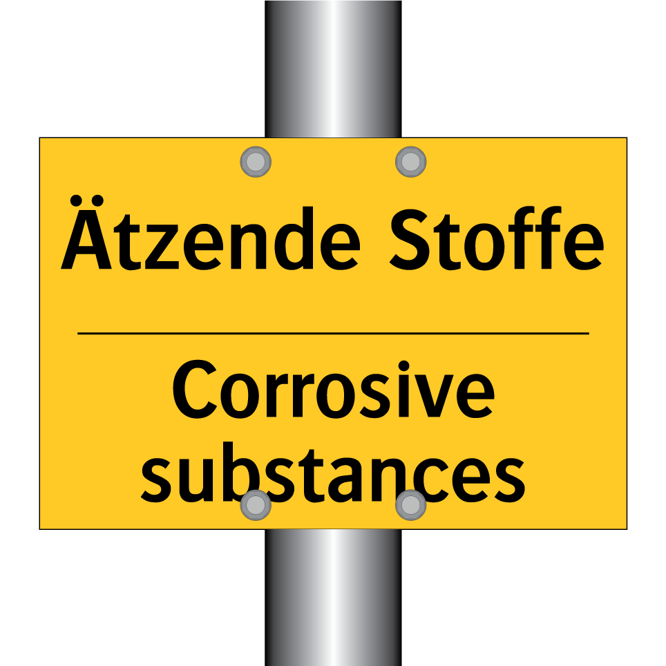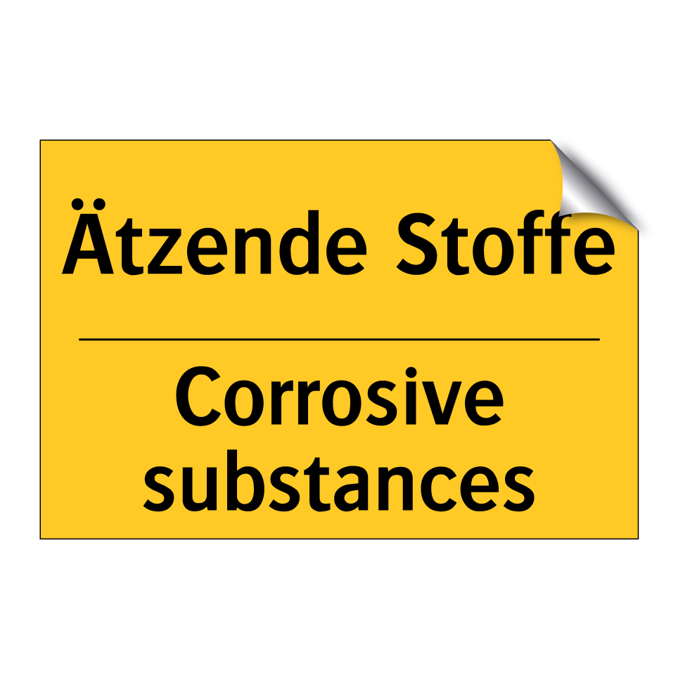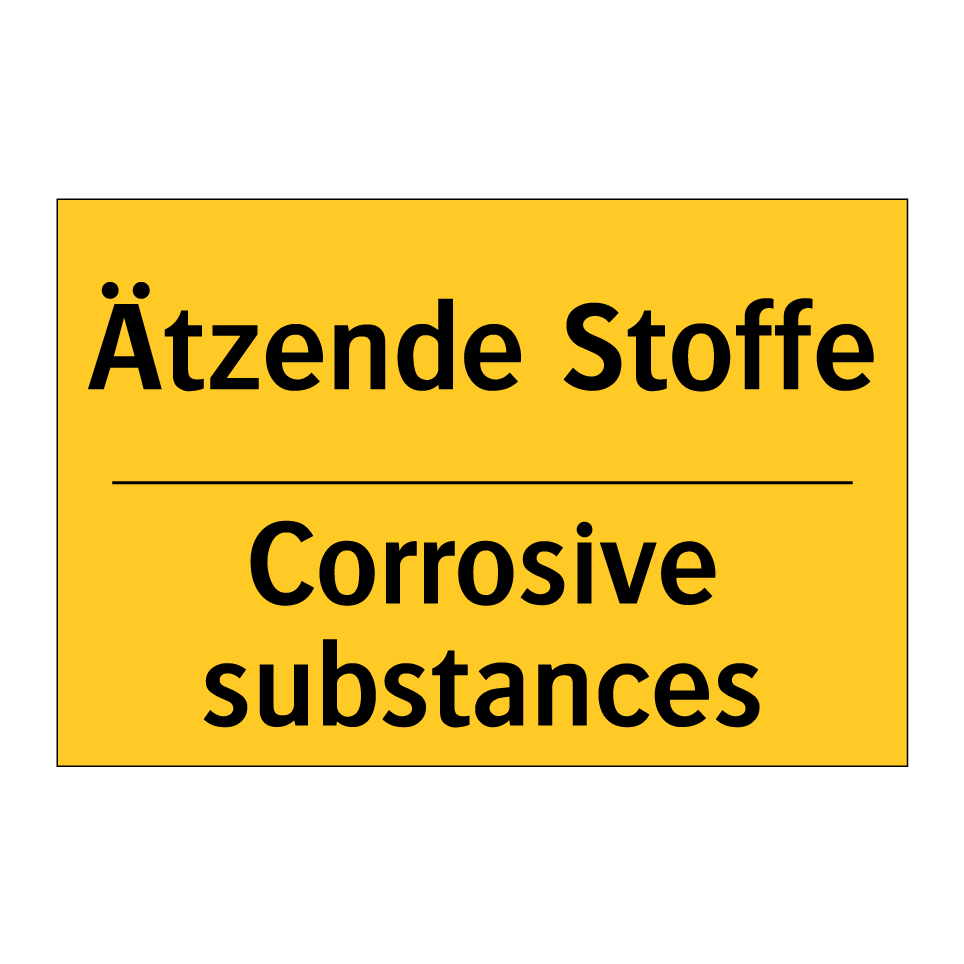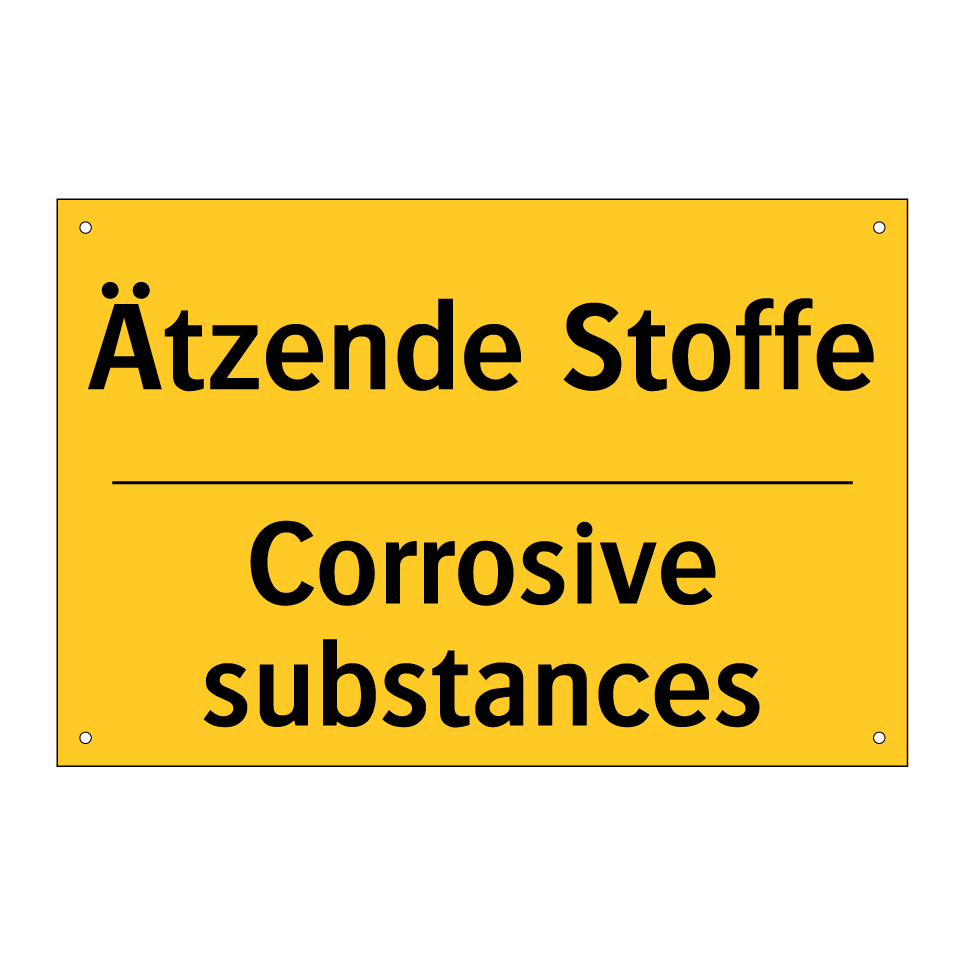 Zweisprachiges Warnschild mit deutschem Text Ätzende Stoffe und englischem Text Corrosive substances