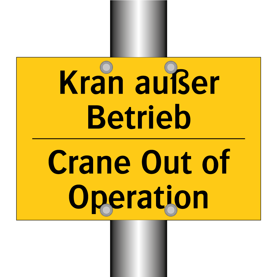 Zweisprachiges Warnschild mit deutschem Text Kran außer Betrieb und englischem Text Crane Out of Operation