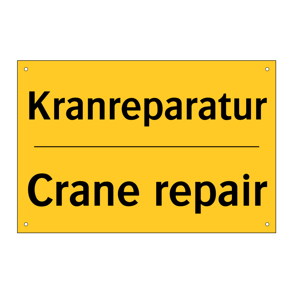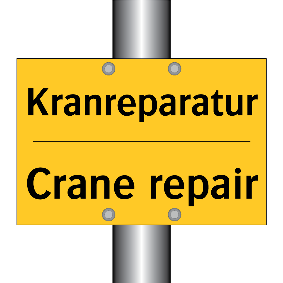Zweisprachiges Warnschild mit deutschem Text Kranreparatur und englischem Text Crane repair