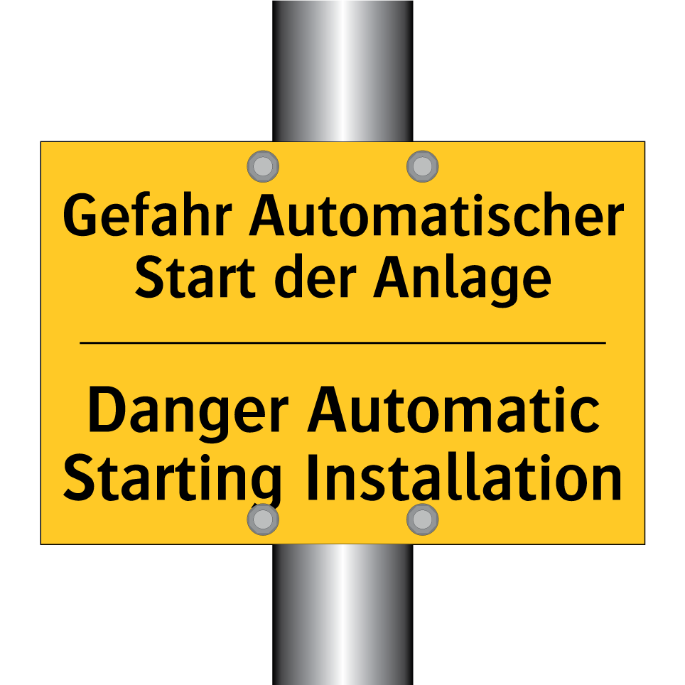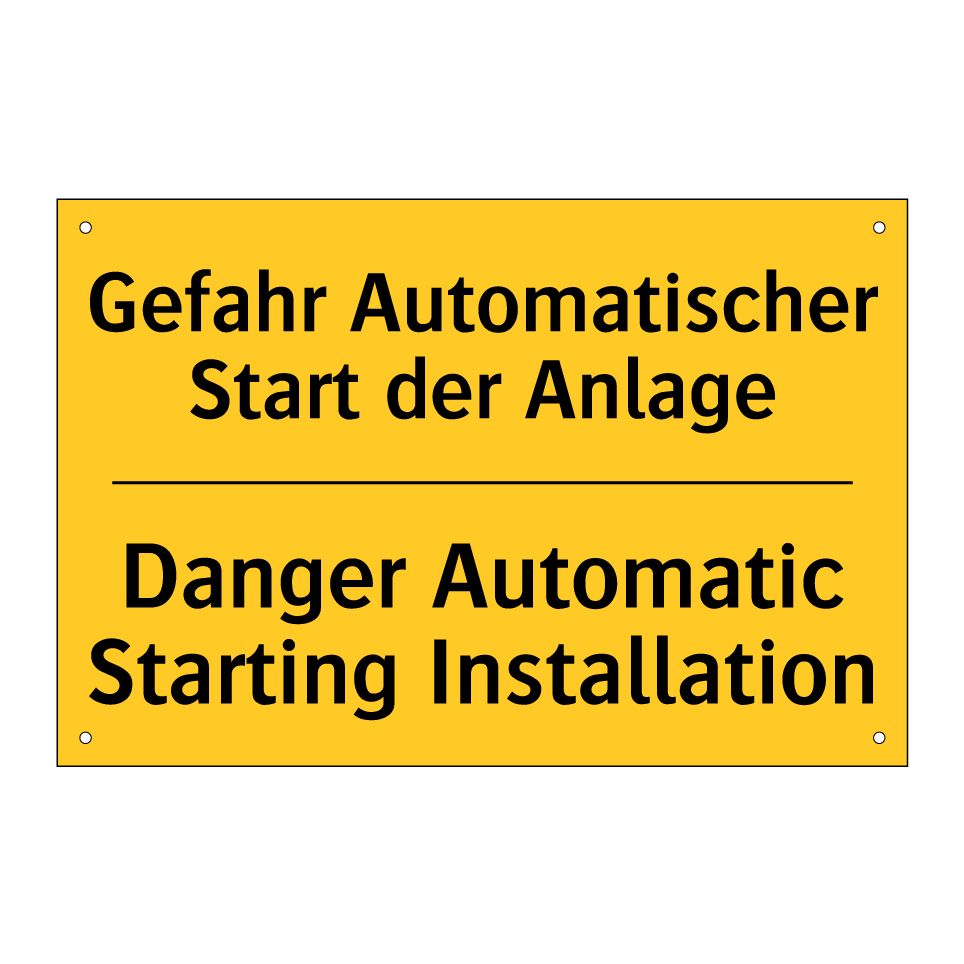 Zweisprachiges Warnschild mit deutschem Text Gefahr Automatischer Start der Anlage und englischem Text Danger Automatic Starting Installation