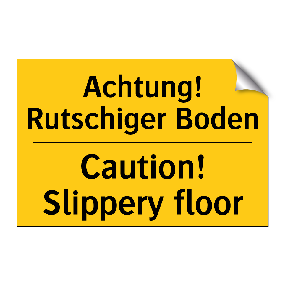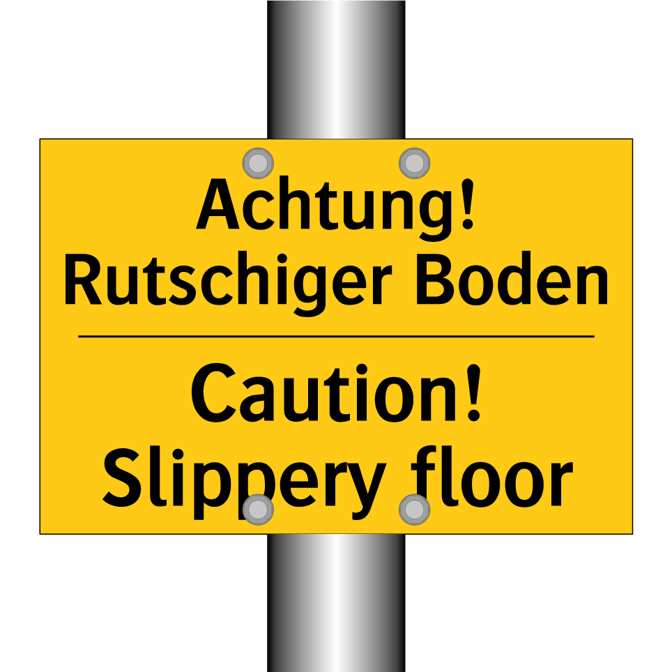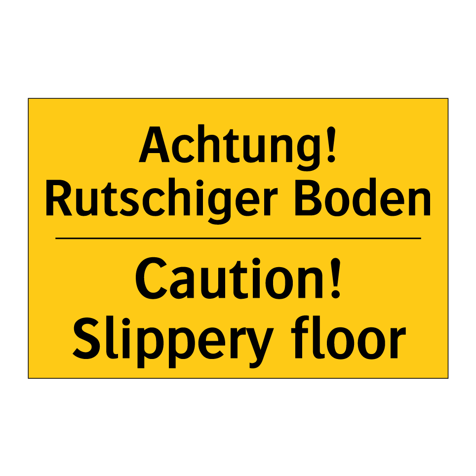 Zweisprachiges Warnschild mit deutschem Text Achtung! Rutschiger Boden und englischem Text Caution! Slippery floor