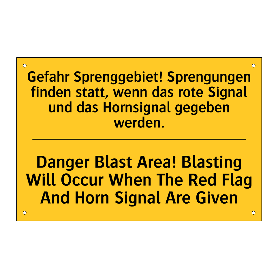 Zweisprachiges Warnschild mit deutschem Text Gefahr Sprenggebiet! Sprengungen finden statt, wenn das rote Signal und das Hornsignal gegeben werden. und englischem Text Danger Blast Area! Blasting Will Occur When The Red Flag And Horn Signal Are Given