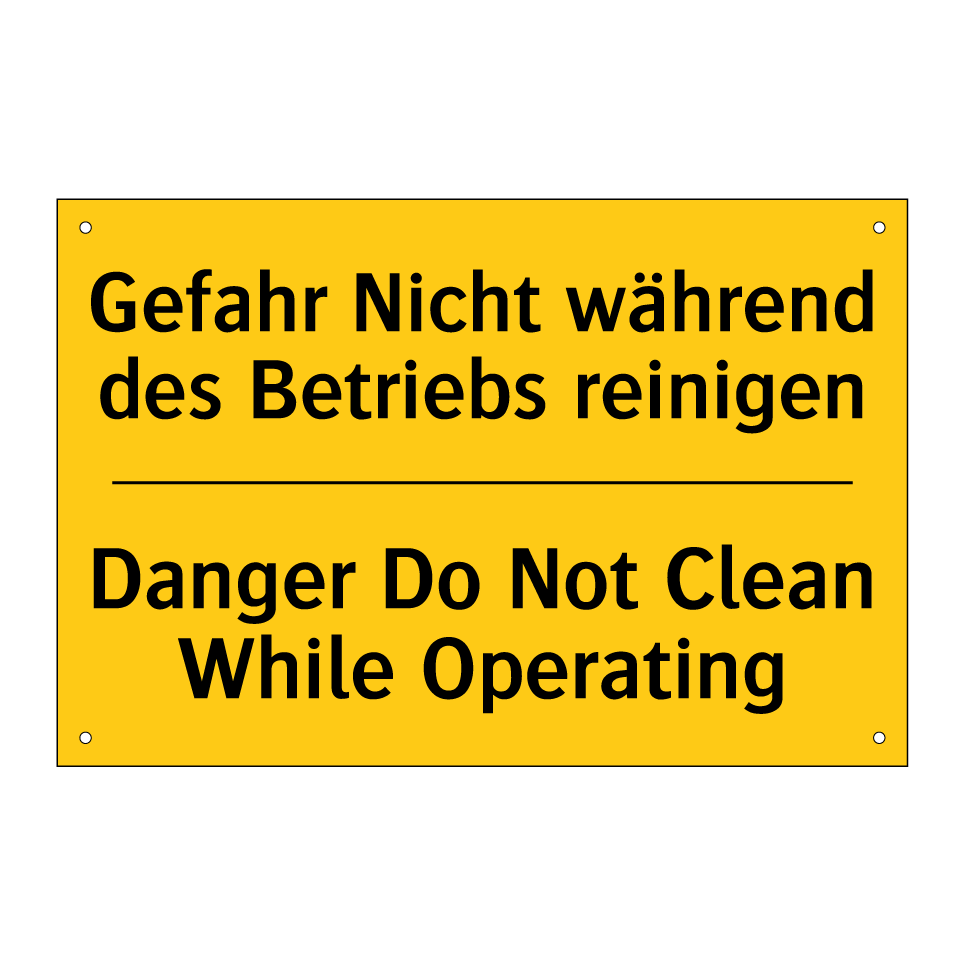 Zweisprachiges Warnschild mit deutschem Text Gefahr Nicht während des Betriebs reinigen und englischem Text Danger Do Not Clean While Operating