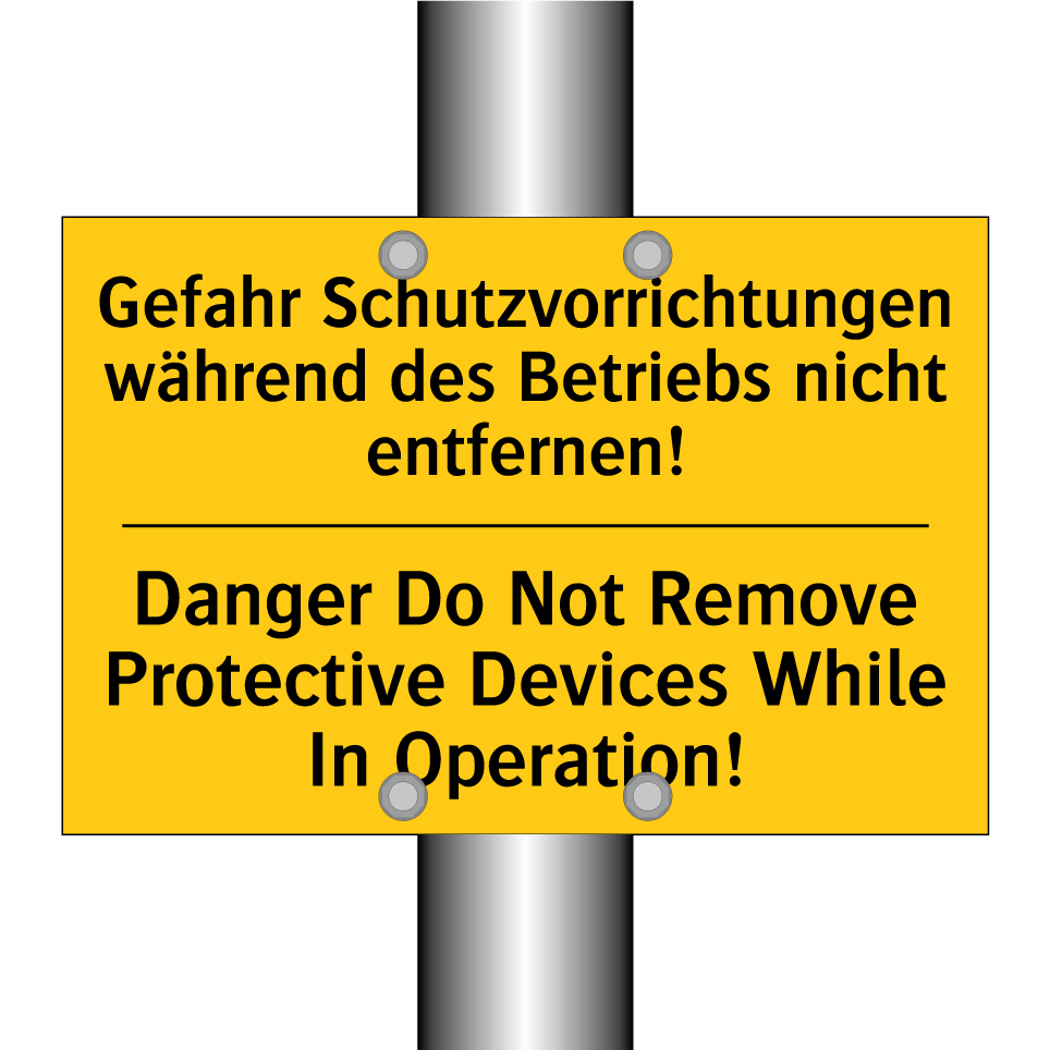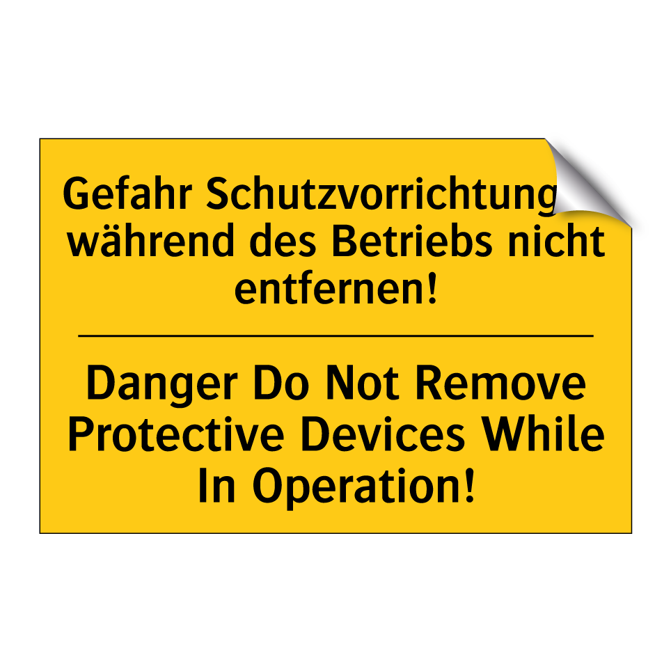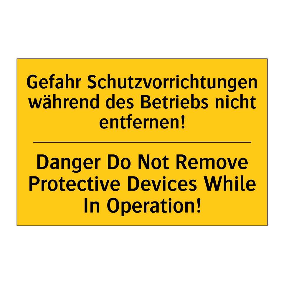 Zweisprachiges Warnschild mit deutschem Text Gefahr Schutzvorrichtungen während des Betriebs nicht entfernen! und englischem Text Danger Do Not Remove Protective Devices While In Operation!