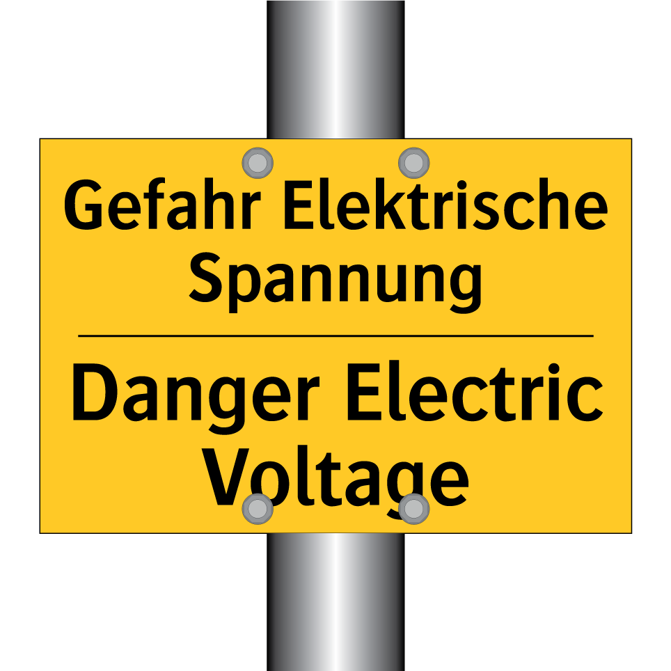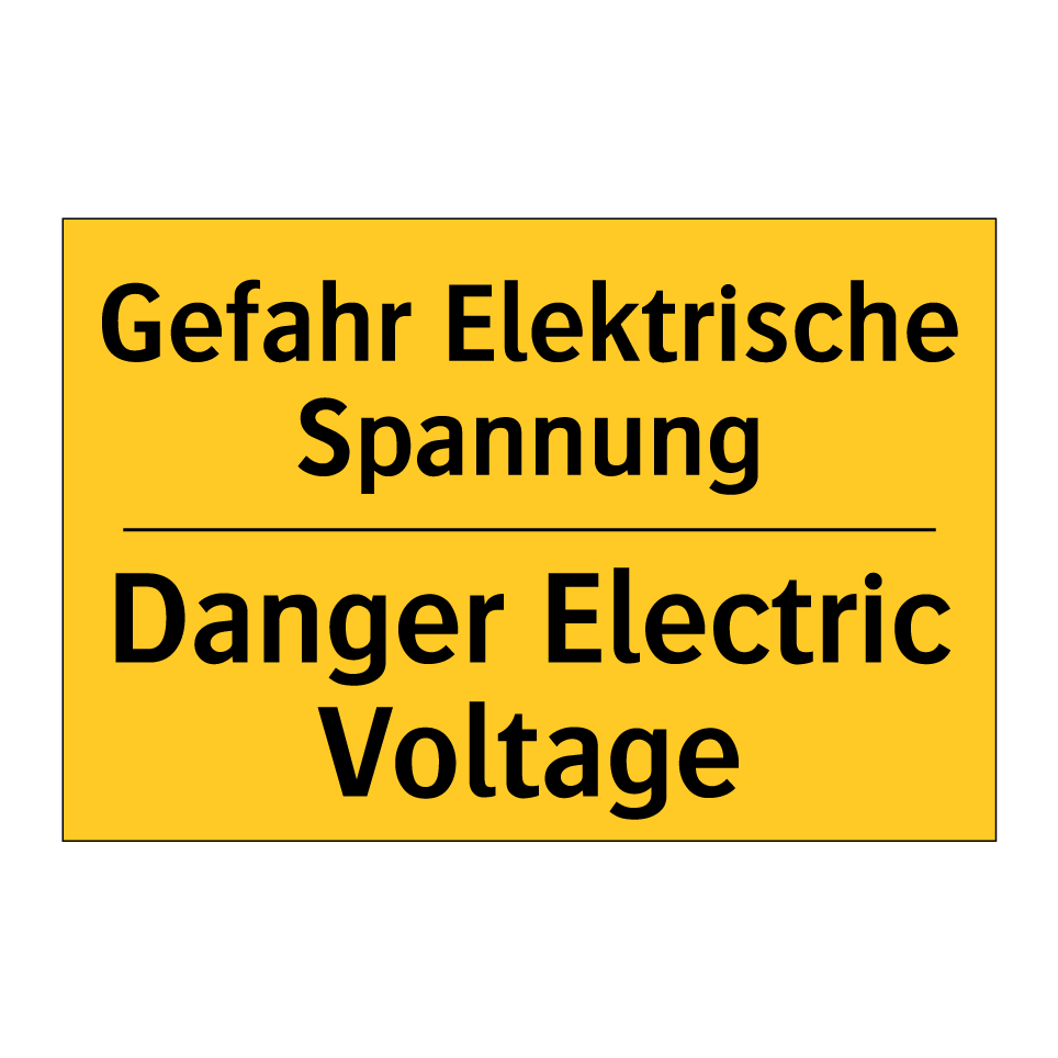 Zweisprachiges Warnschild mit deutschem Text Gefahr Elektrische Spannung und englischem Text Danger Electric Voltage