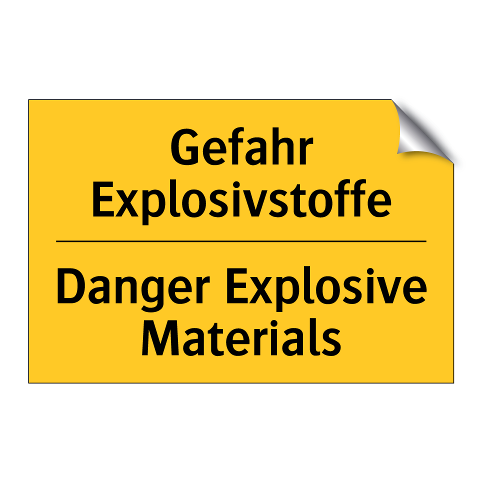Zweisprachiges Warnschild mit deutschem Text Gefahr Explosivstoffe und englischem Text Danger Explosive Materials