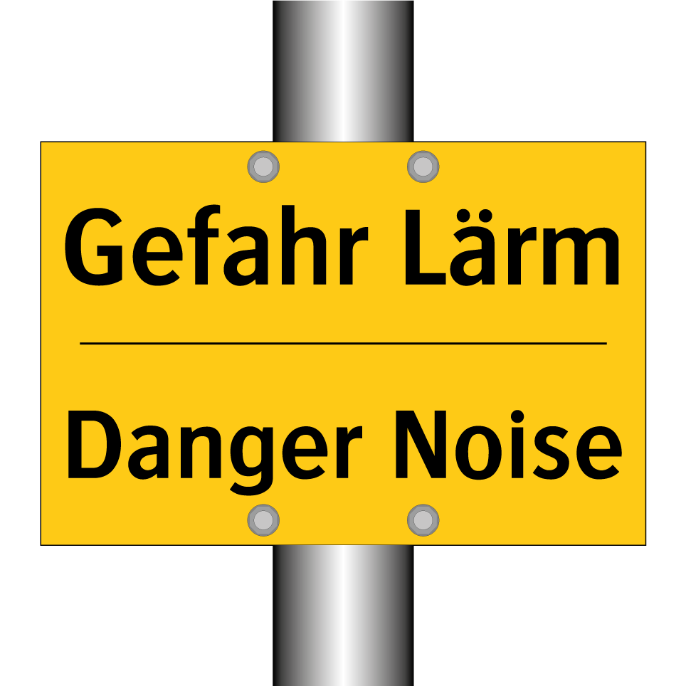 Zweisprachiges Warnschild mit deutschem Text Gefahr Lärm und englischem Text Danger Noise