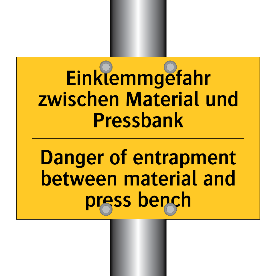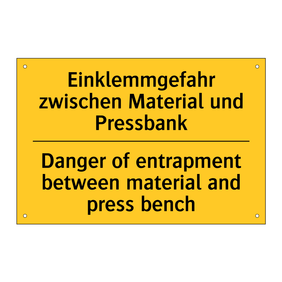 Zweisprachiges Warnschild mit deutschem Text Einklemmgefahr zwischen Material und Pressbank und englischem Text Danger of entrapment between material and press bench