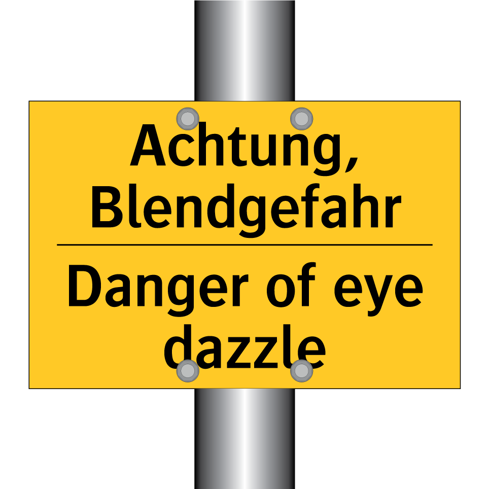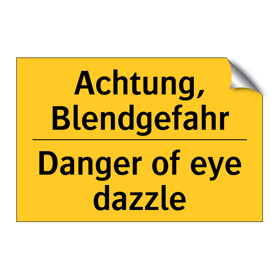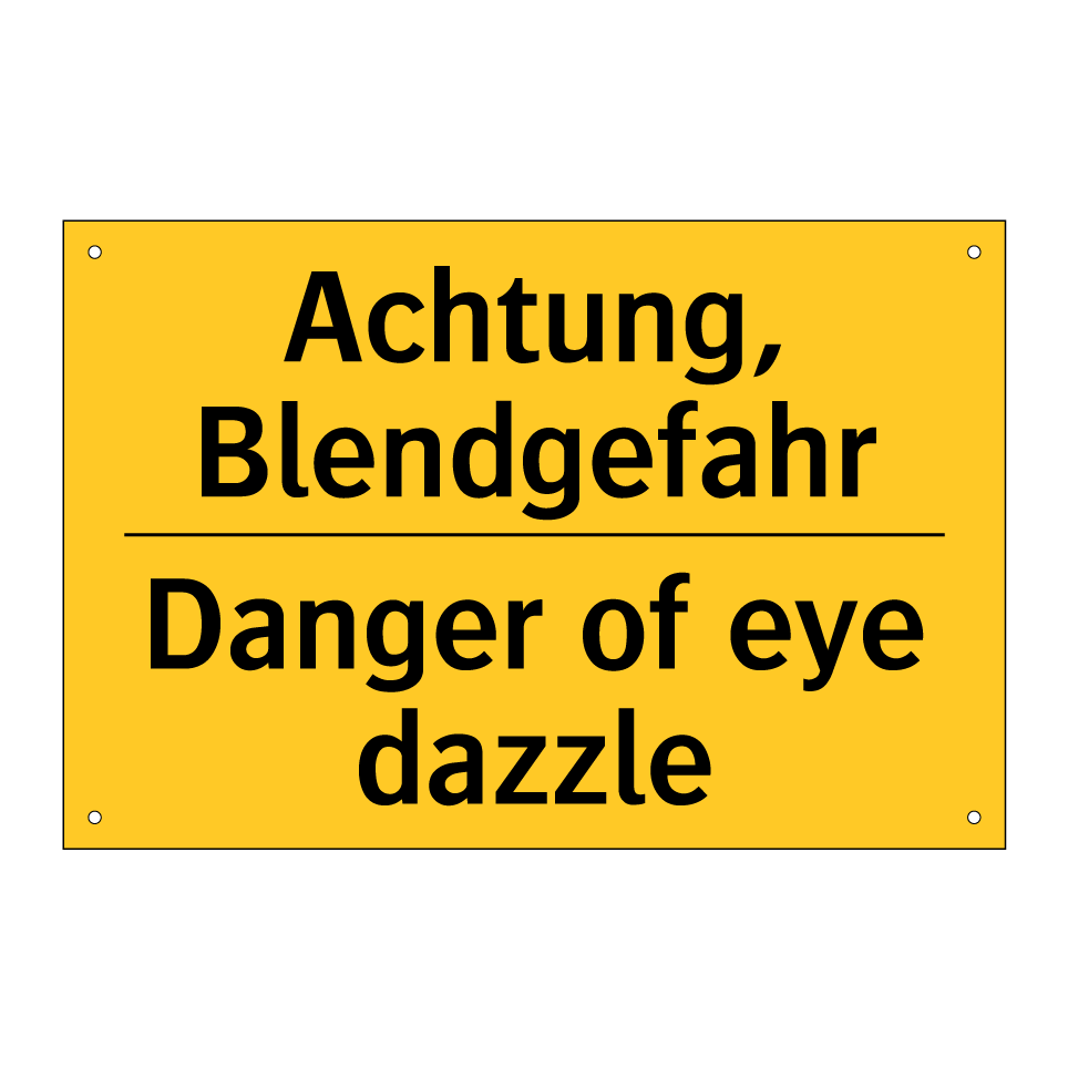 Zweisprachiges Warnschild mit deutschem Text Achtung, Blendgefahr und englischem Text Danger of eye dazzle