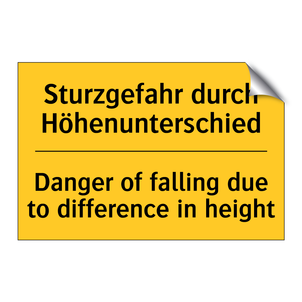 Zweisprachiges Warnschild mit deutschem Text Sturzgefahr durch Höhenunterschied und englischem Text Danger of falling due to difference in height