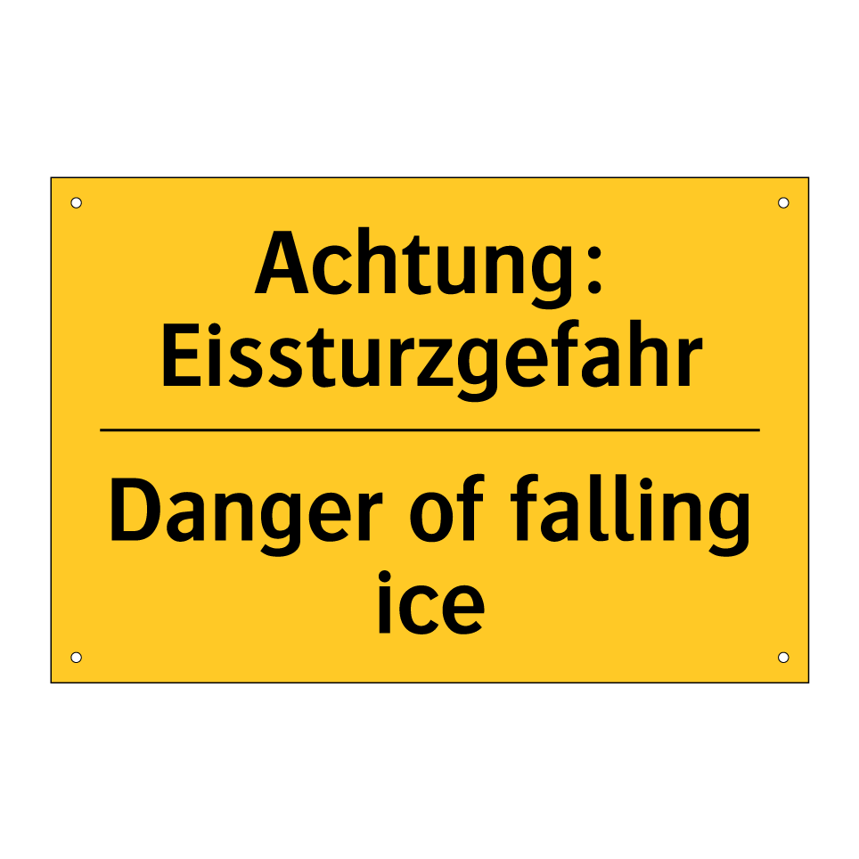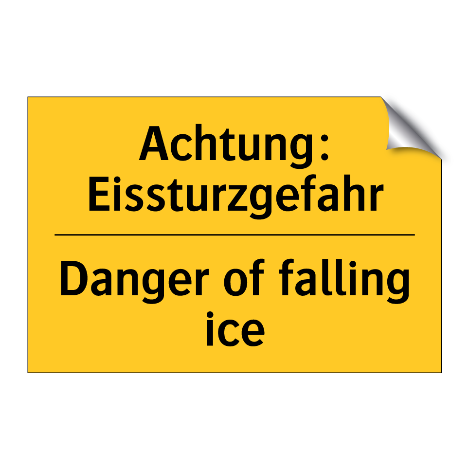 Zweisprachiges Warnschild mit deutschem Text Achtung: Eissturzgefahr und englischem Text Danger of falling ice