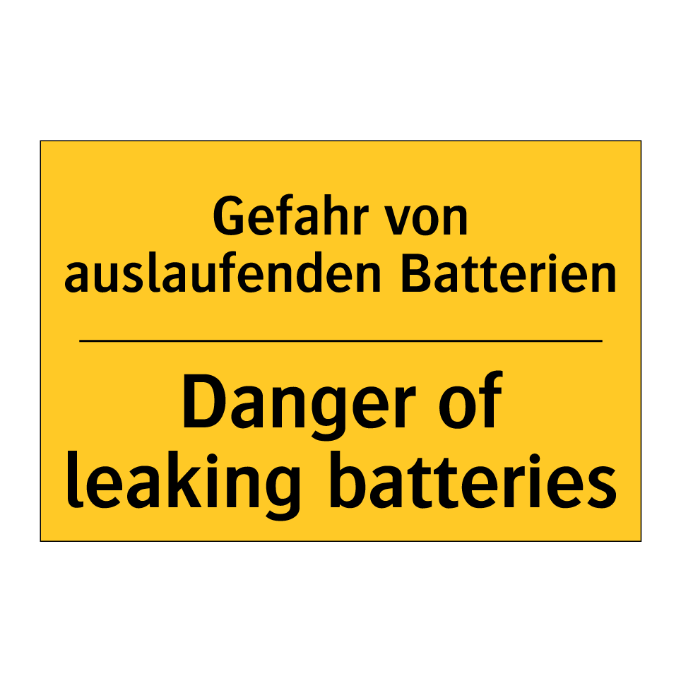 Zweisprachiges Warnschild mit deutschem Text Gefahr von auslaufenden Batterien und englischem Text Danger of leaking batteries