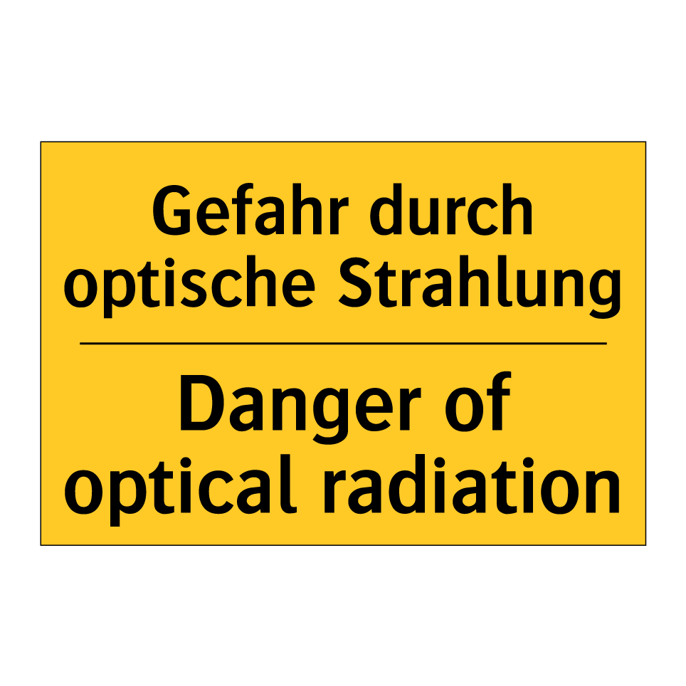Zweisprachiges Warnschild mit deutschem Text Gefahr durch optische Strahlung und englischem Text Danger of optical radiation
