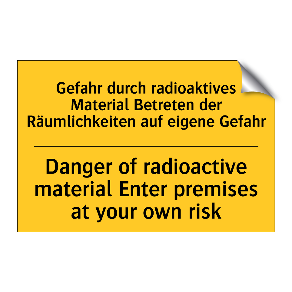 Zweisprachiges Warnschild mit deutschem Text Gefahr durch radioaktives Material Betreten der Räumlichkeiten auf eigene Gefahr und englischem Text Danger of radioactive material Enter premises at your own risk
