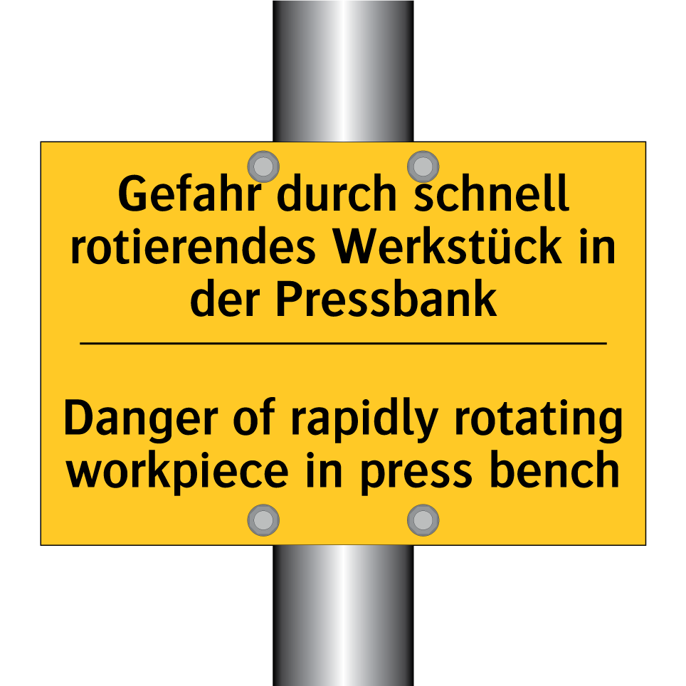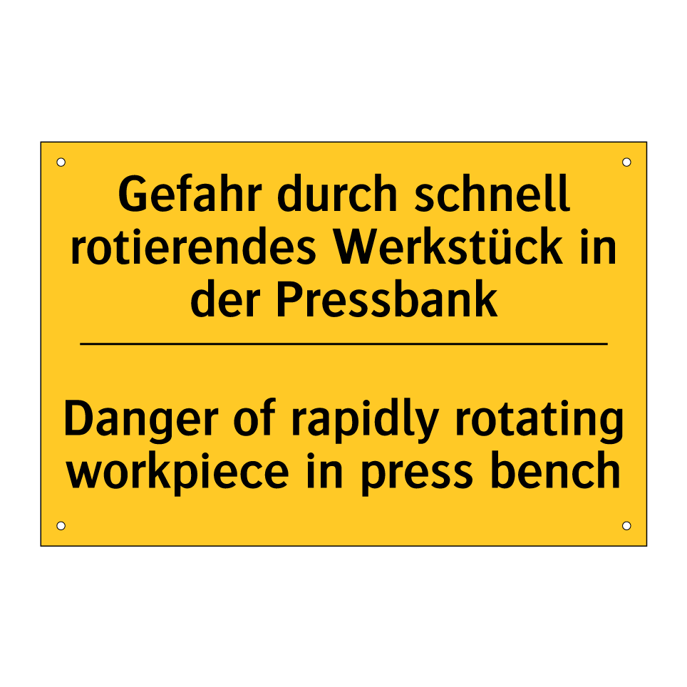 Zweisprachiges Warnschild mit deutschem Text Gefahr durch schnell rotierendes Werkstück in der Pressbank und englischem Text Danger of rapidly rotating workpiece in press bench