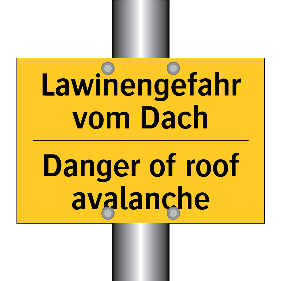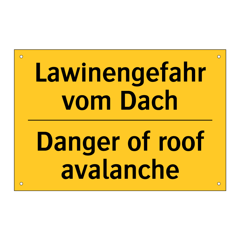 Zweisprachiges Warnschild mit deutschem Text Lawinengefahr vom Dach und englischem Text Danger of roof avalanche