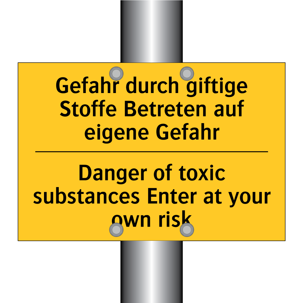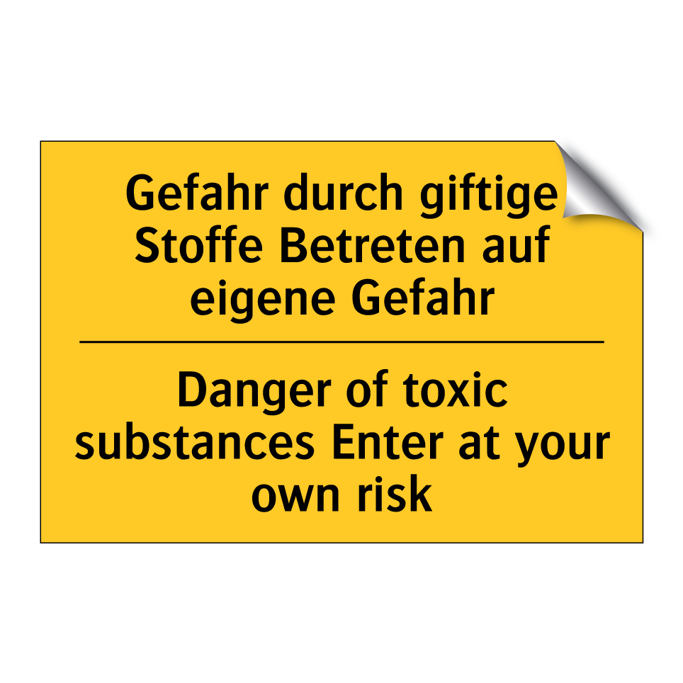 Zweisprachiges Warnschild mit deutschem Text Gefahr durch giftige Stoffe Betreten auf eigene Gefahr und englischem Text Danger of toxic substances Enter at your own risk
