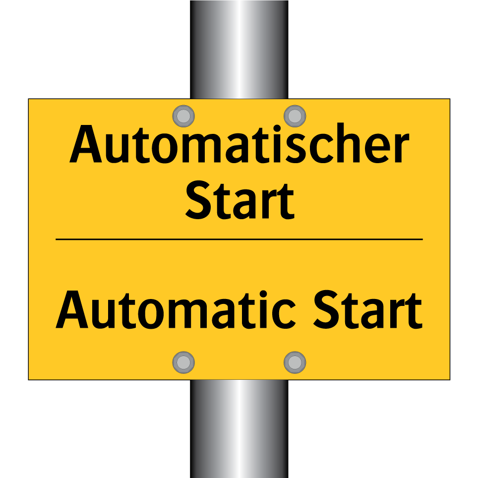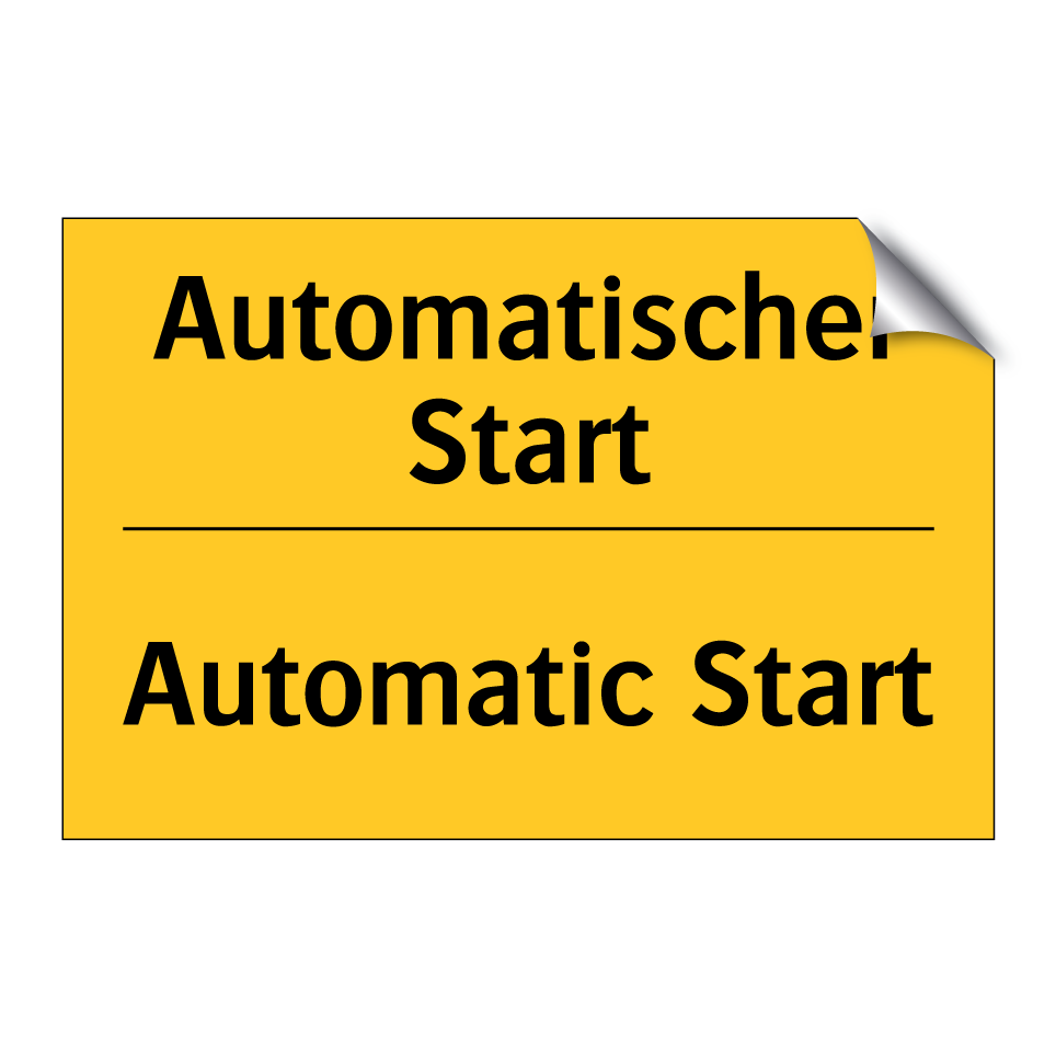 Zweisprachiges Warnschild mit deutschem Text Automatischer Start und englischem Text Automatic Start