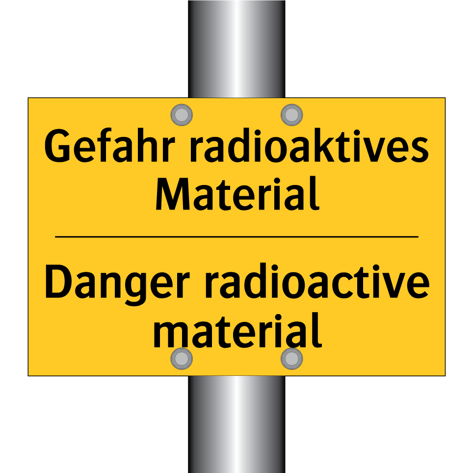 Zweisprachiges Warnschild mit deutschem Text Gefahr radioaktives Material und englischem Text Danger radioactive material