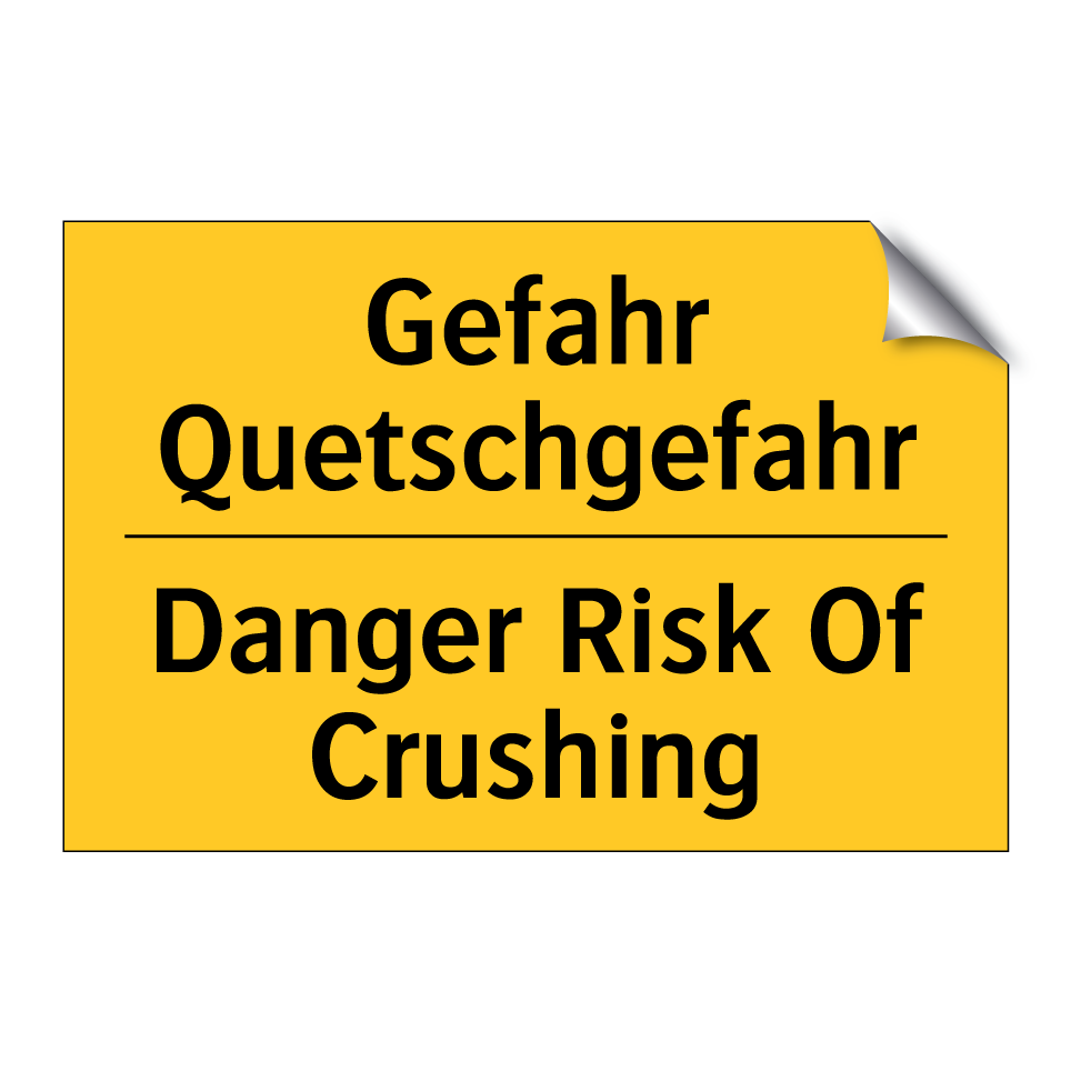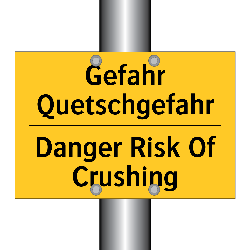 Zweisprachiges Warnschild mit deutschem Text Gefahr Quetschgefahr und englischem Text Danger Risk Of Crushing